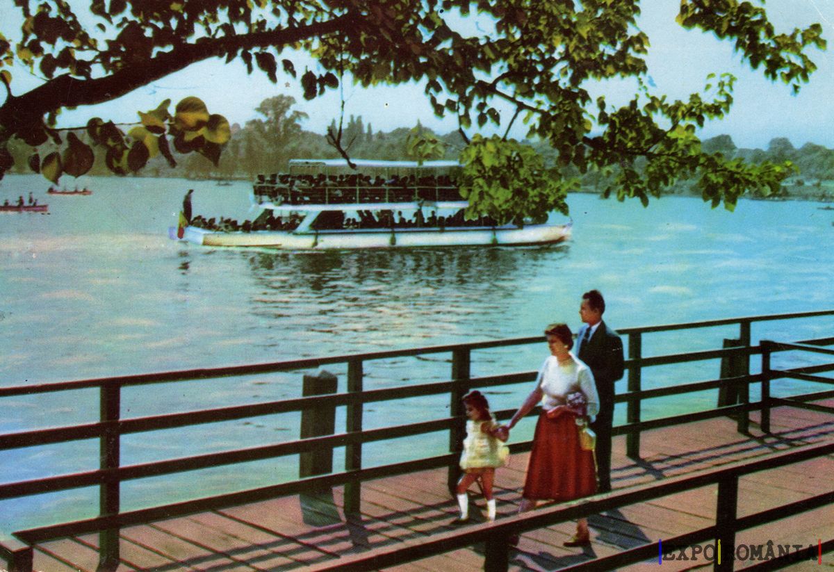 Imaginea reprezintă o scenă pitorească din București, cu un peisaj de apă și vegetație. În prim-plan, o familie formată dintr-un bărbat, o femeie și o fetiță se plimbă pe un promenadă din lemn, având în fundal un vapor de agrement care navighează pe apă. Femeia poartă o fustă lungă și elegantă, iar fetița este îmbrăcată într-o rochiță deschisă la culoare. Bărbatul, îmbrăcat într-un costum, îi ține de mână pe cei doi. Deasupra lor, ramurile unui copac oferă umbră, adăugând un sentiment de liniște și relaxare. Pe apă, se pot observa și alte ambarcațiuni, iar atmosfera generală sugerează o zi frumoasă de vară.
