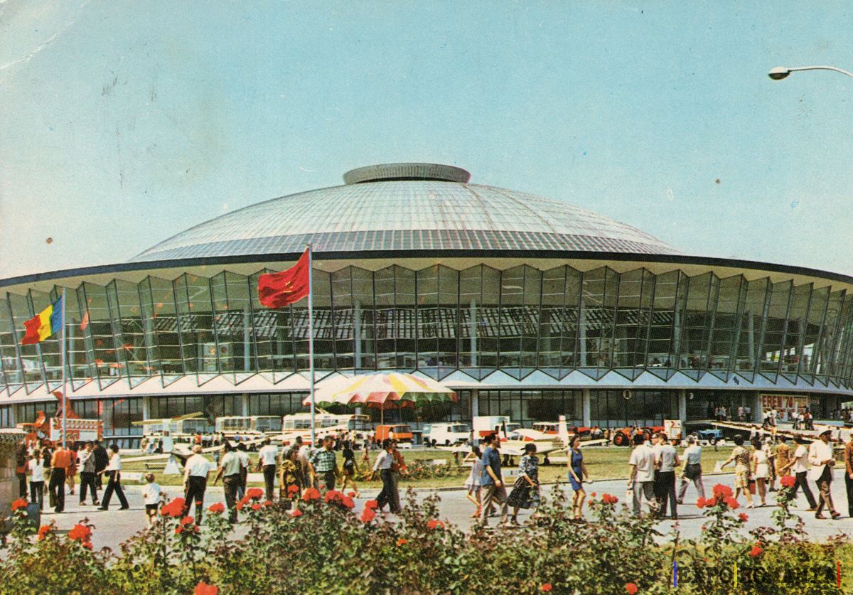 Imaginea reprezintă o carte poștală din București, evidențiind o clădire modernă cu o arhitectură distinctivă, având un acoperiș circular și o fațadă din sticlă. În fața clădirii, se află un grup de oameni care se plimbă, iar atmosfera este animată. Pe lângă clădire, se pot observa mai multe mașini parcate și un stand cu umbrele colorate. În jurul zonei sunt flori de trandafir roșii, adăugând un contrast vibrant pe fundalul cerului senin. Drapelele României și ale altor țări flutură în vânt, sugerând un eveniment sau o sărbătoare.