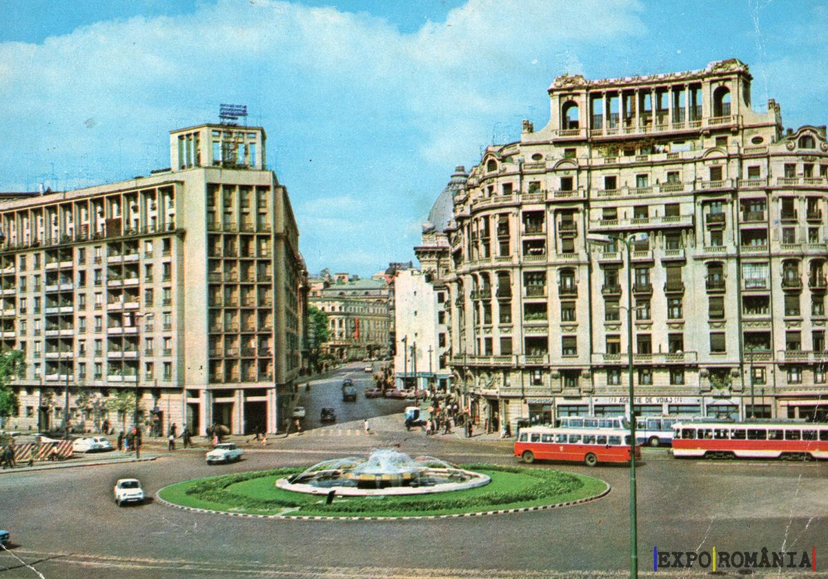 Imaginea prezintă o scenă urbană din București, cu un bulevard larg și o intersecție animată. În centrul imaginii se află o fântână, înconjurată de un rond de iarbă verde. Pe marginea bulevardului, se pot observa clădiri cu arhitectură variată, unele cu detalii ornamentale elaborate. În stânga, o clădire modernă se înalță, contrastând cu clădirea istorică din dreapta, care are un aspect mai clasic. Pe drum circulă vehicule, inclusiv autobuze și mașini, iar atmosfera sugerează o zi însorită, cu cer senin. Această imagine surprinde dinamismul și diversitatea arhitecturală a capitalei României.
