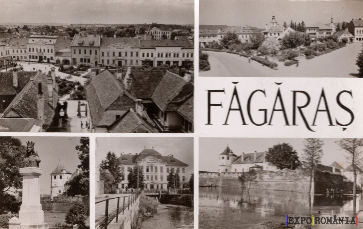 Imaginea reprezintă o carte poștală cu o compunere de fotografii ale orașului Făgăraș. În colțul din stânga sus, se observă o panoramă a clădirilor istorice, cu acoperișuri din țiglă. În colțul din dreapta sus, se află o imagine a unui peisaj urban, cu vegetație și clădiri. În partea de jos, sunt prezentate detalii arhitecturale, inclusiv o statuie și un pod care traversează un curs de apă. Textul „Făgăraș” este plasat proeminent în partea centrală a imaginii, evidențiind numele orașului. Tonurile predominante sunt alb-negru, conferind un aspect nostalgic.
