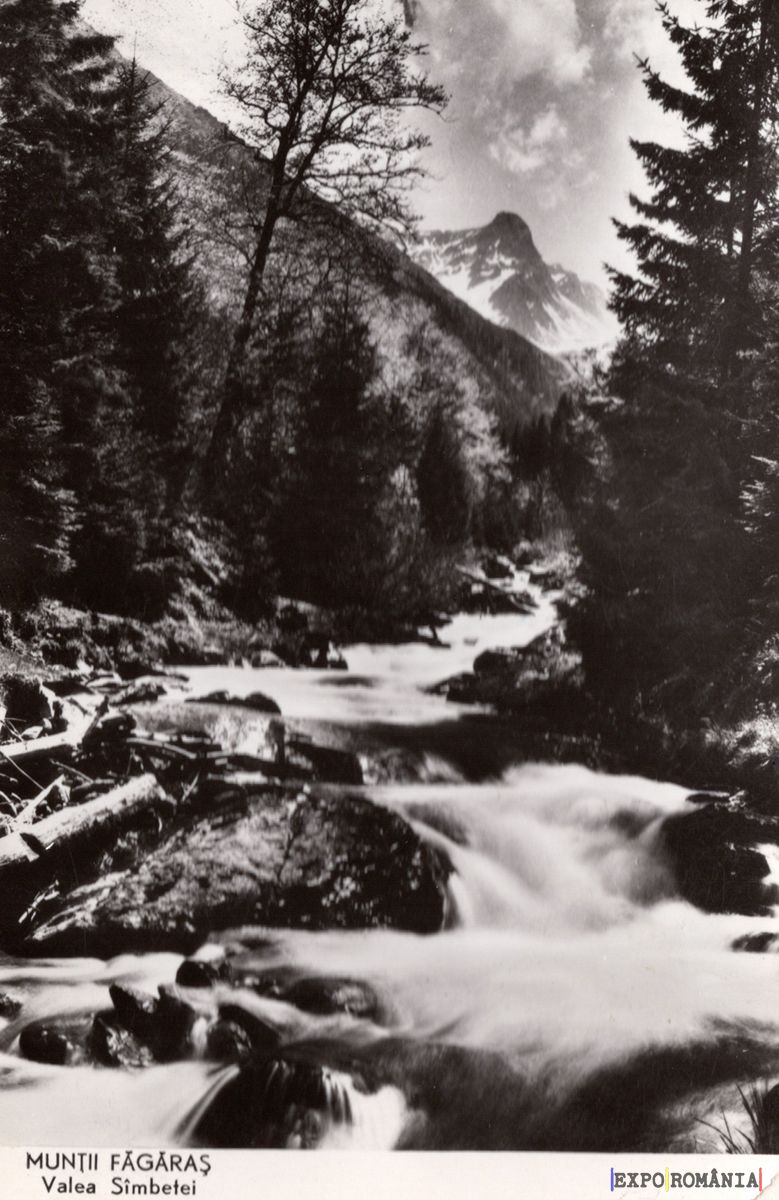 Imaginea reprezintă o carte poștală în alb și negru, care ilustrează un peisaj montan din Munții Făgăraș. În prim-plan, un râu curge rapid, cu ape cristalline ce formează valuri. Pe malurile râului, se observă trunchiuri de copaci căzuți și vegetație densă. În fundal, se ridică un vârf montan acoperit parțial de zăpadă, iar cerul este presărat cu nori. Peisajul evocă o atmosferă de liniște și frumusețe naturală, specifică zonei Valea Sîmbetei.