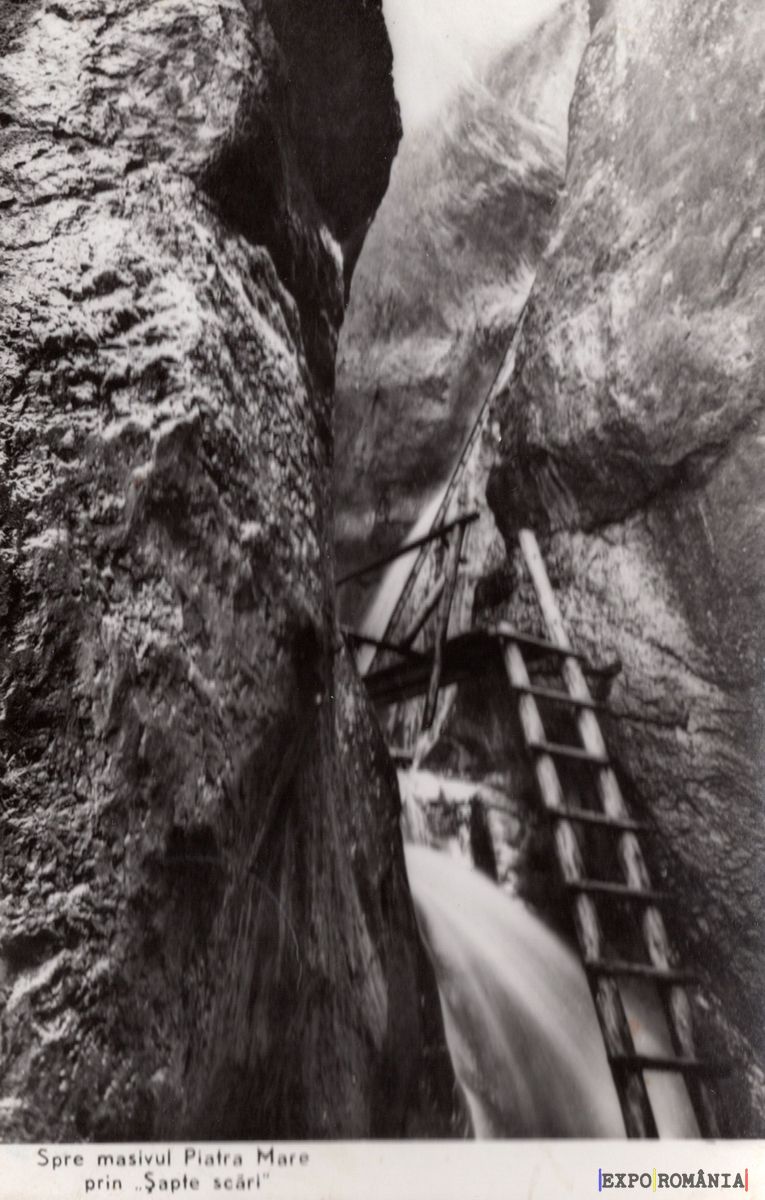 Imaginea reprezintă o carte poștală în alb și negru, care ilustrează un peisaj montan. În centrul imaginii se află o stâncă înaltă, cu o textură rugoasă, ce se ridică pe verticală. Pe partea stângă, se observă o scară din lemn, care pare să conducă spre un traseu montan. În fundal, se poate vedea un flux de apă care curge, sugerând prezența unei cascade sau a unui pârâu. Pe partea inferioară a imaginii, există un text care indică direcția: „Spre masivul Piatra Mare prin Șapte scări”. Atmosfera generală evocă un sentiment de aventură și explorare în natură.