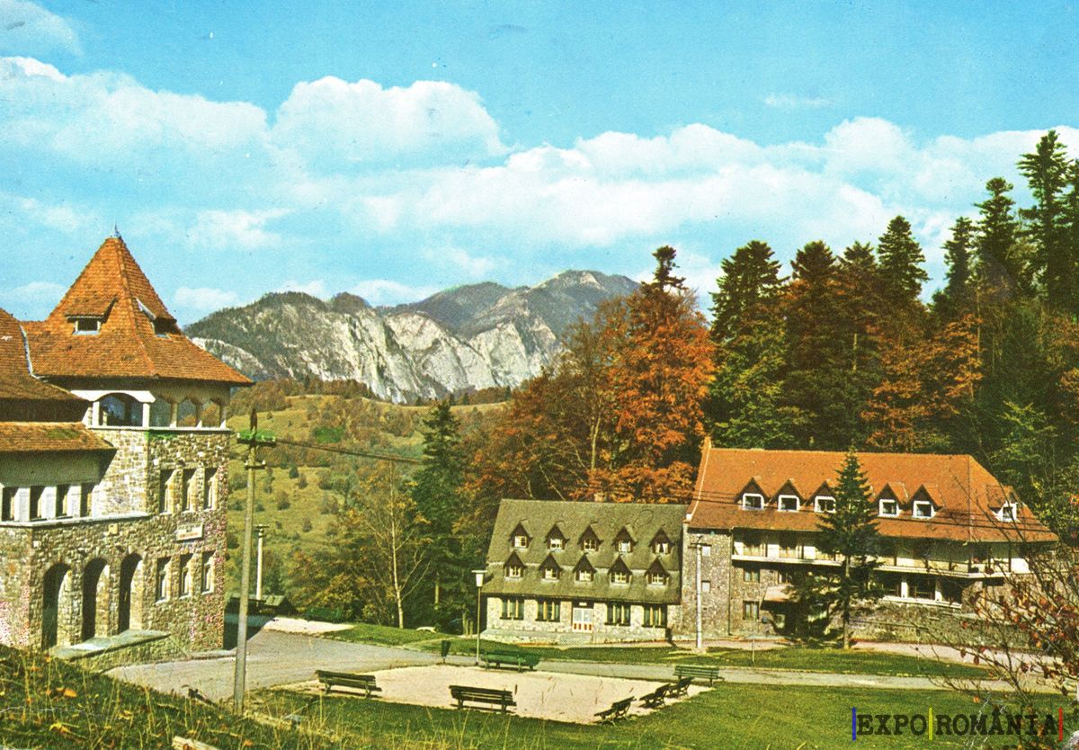 Imaginea prezintă un peisaj montan, cu două clădiri pitorești situate într-o zonă verde. Clădirea din stânga, cu un acoperiș ascuțit și detalii arhitecturale din piatră, emană un aer rustic. În dreapta, o clădire mai joasă, cu feronerie de lemn și acoperiș înclinat, se integrează armonios în peisaj. În fundal, se ridică munți impunători, iar cerul este senin, cu câteva nori pufoși. Vegetația din jur este bogată, cu copaci care își schimbă culorile în nuanțe de verde și galben, sugerând o atmosferă de toamnă. Zona pare să fie ideală pentru relaxare și explorare în natură.