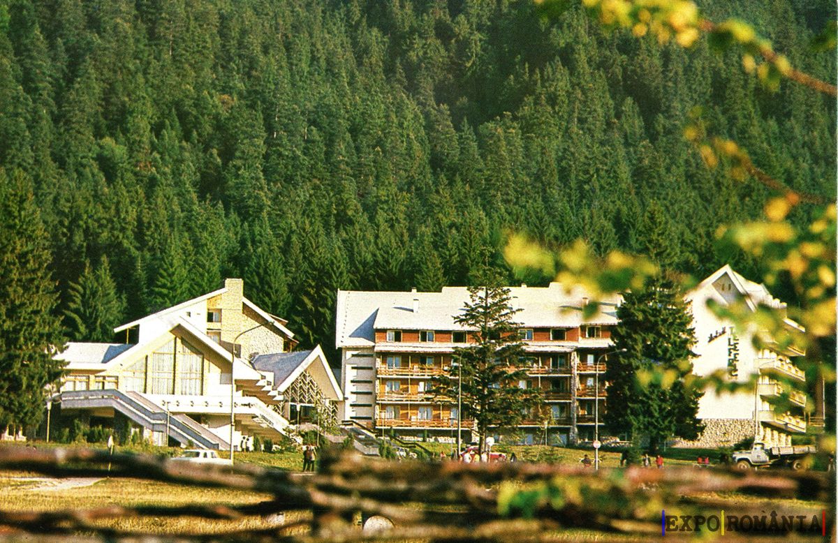 Imaginea prezintă un peisaj montan, cu un complex hotelier situat într-o zonă împădurită. Clădirile au arhitecturi moderne, cu feronerie din lemn și feronerie de sticlă, integrate armonios în natura din jur. În fața hotelului se află o zonă verde, iar în fundal se ridică păduri dense de conifere, sugerând un mediu liniștit și relaxant. Atmosfera este una de vacanță, ideală pentru iubitorii de natură și de activități în aer liber.