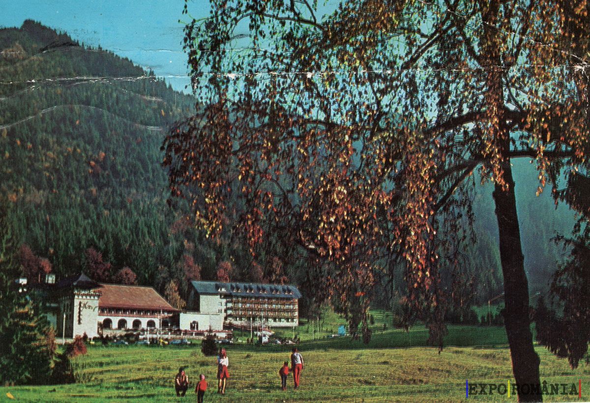 Imaginea prezintă un peisaj montan idilic, cu o clădire de tip hotel situată într-o zonă verde, deschisă. În prim-plan, se observă câțiva oameni care se plimbă pe o pajiște, înconjurați de copaci și vegetație. În fundal, se ridică munți acoperiți de păduri dense, iar cerul este senin, sugerând o zi frumoasă. Clădirea are un design tradițional, cu feronerie și balcoane, integrându-se armonios în peisajul natural. Atmosfera este una de liniște și relaxare, evocând un sentiment de evadare în natură.