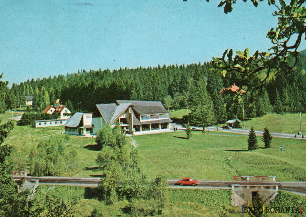 Imaginea prezintă un peisaj rural, cu o clădire mare și modernă, situată pe o pajiște verde. Clădirea are un design arhitectural distinctiv, cu un acoperiș înclinat și feronerie din lemn. În jurul acesteia se află câteva case mai mici, de tip tradițional, înconjurate de copaci înalți. În fundal, se observă o pădure densă, cu arbori verzi care se întind pe o distanță mare. O șosea trece prin partea de jos a imaginii, iar un automobil roșu este vizibil pe aceasta. Cerul este senin, iar atmosfera generală sugerează un loc liniștit și pitorească, ideal pentru relaxare și recreere.