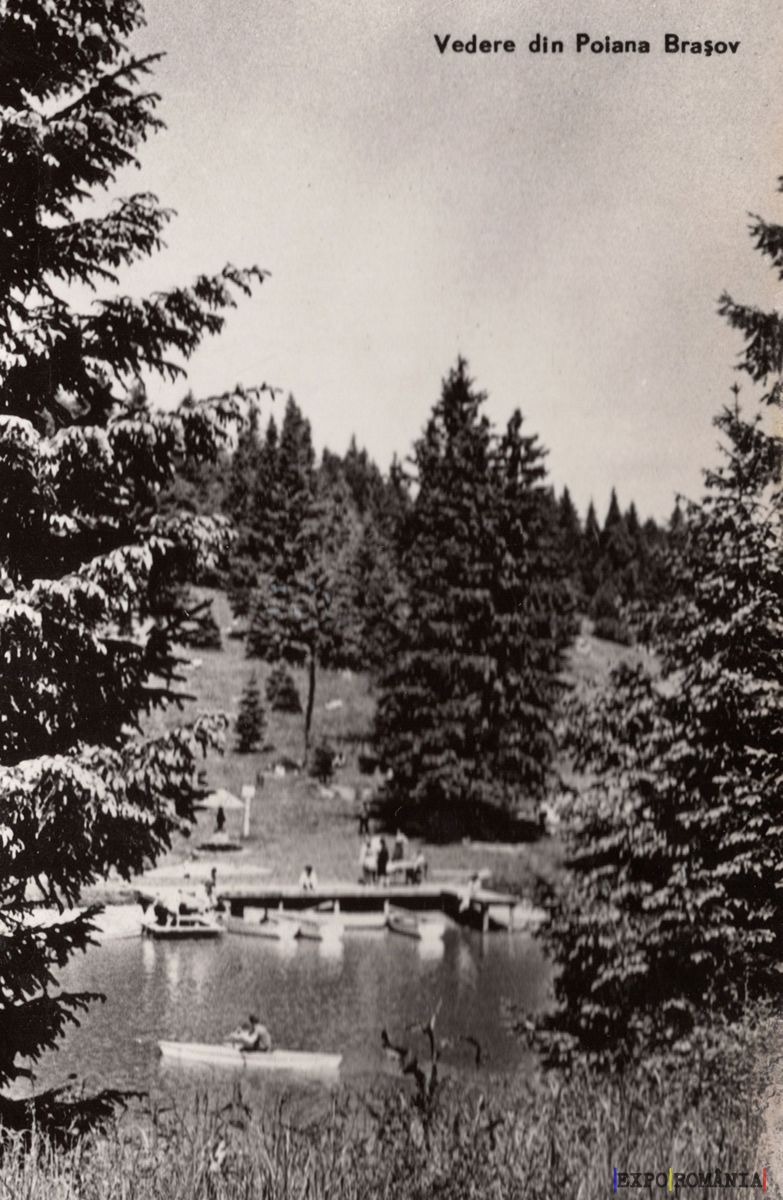 Imaginea reprezintă o carte poștală cu o vedere din Poiana Brașov. În prim-plan, se observă un lac mic, în jurul căruia se află câteva bărci. Pe malul lacului, oameni se bucură de natură, iar câțiva sunt implicați în activități recreative. În fundal, se ridică păduri dense de conifere, iar peisajul este completat de o atmosferă liniștită și naturală. Cerul este senin, iar lumina sugerează o zi frumoasă de vară. Textul de sus indică locația: „Vederea din Poiana Brașov”.