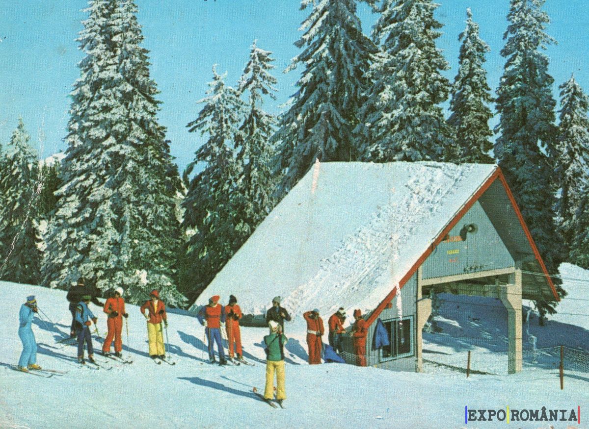 Imaginea prezintă o scenă de iarnă, cu un peisaj acoperit de zăpadă. În prim-plan, un grup de schiori se află lângă o cabană de schi, care are un acoperiș acoperit de zăpadă. Cabană este construită din lemn și are un design simplu, cu feronerie vizibilă. În jurul cabanei, se află copaci înalți, acoperiți cu zăpadă, creând o atmosferă pitorească și liniștită. Schiorii sunt îmbrăcați în echipament colorat, iar unii dintre ei par să aștepte să urce pe pârtie. Cerul este senin, sugerând o zi frumoasă de iarnă.