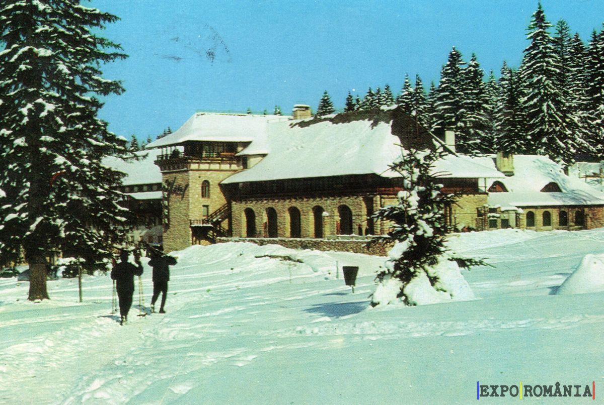 Imaginea prezintă o scenă de iarnă, cu un peisaj acoperit de zăpadă. În prim-plan, două siluete umane se îndreaptă spre o clădire mare, construită din piatră și lemn, care se află în fundal. Acoperișul clădirii este acoperit cu un strat gros de zăpadă, iar feroneria și detaliile arhitecturale sugerează un stil tradițional. În jurul clădirii, se află copaci înalți, acoperiți cu zăpadă, care contribuie la atmosfera de liniște și frumusețe a peisajului. Cerul este senin, cu nuanțe de albastru, adăugând o notă de claritate și prospețime scenei.