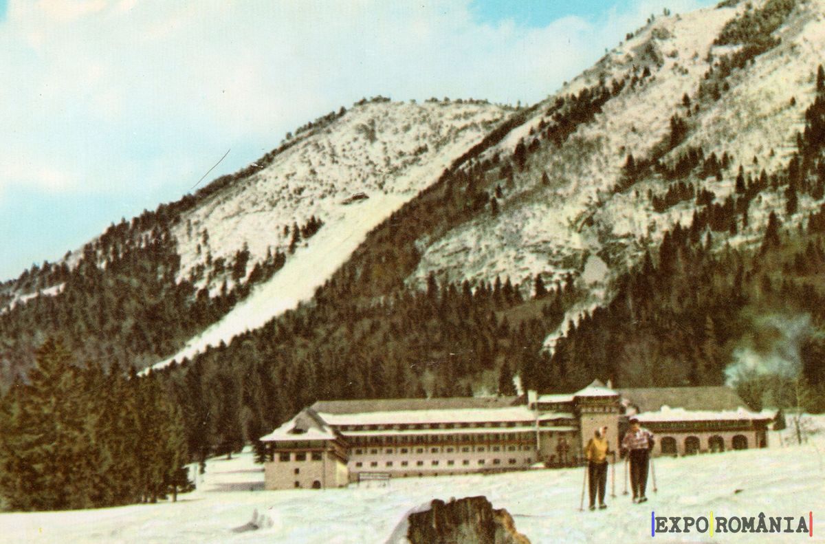 Imaginea prezintă un peisaj montan acoperit de zăpadă, cu un hotel sau o clădire mare situată în prim-plan. Clădirea are un design arhitectural distinct, cu mai multe etaje și feronerie de tip tradițional. În fundal, se ridică munți acoperiți de zăpadă, evidențiind un peisaj natural impresionant. În fața clădirii, două persoane sunt surprinse schiind, îmbrăcate în echipament de schi, sugerând o activitate de iarnă. Cerul este parțial noros, dar cu zone de albastru, adăugând un contrast plăcut peisajului. Atmosfera generală evocă o destinație de vacanță montană, ideală pentru iubitorii sporturilor de iarnă.