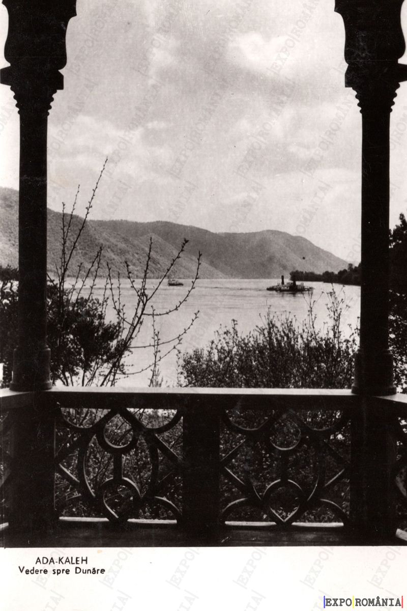 Imaginea reprezintă o carte poștală în alb-negru, având în prim-plan un cadru arhitectural cu detalii decorative. Prin arcada acestuia se poate observa o panoramă a Dunării, cu coline în fundal. Vegetația din apropiere adaugă un contrast natural, iar cerul este parțial acoperit de nori. Textul de pe carte poștală menționează „ADA KALEH” și „Vedere spre Dunăre”, sugerând o locație specifică și un peisaj pitoresc. Atmosfera generală este una de liniște și contemplare, evocând frumusețea naturală a regiunii.