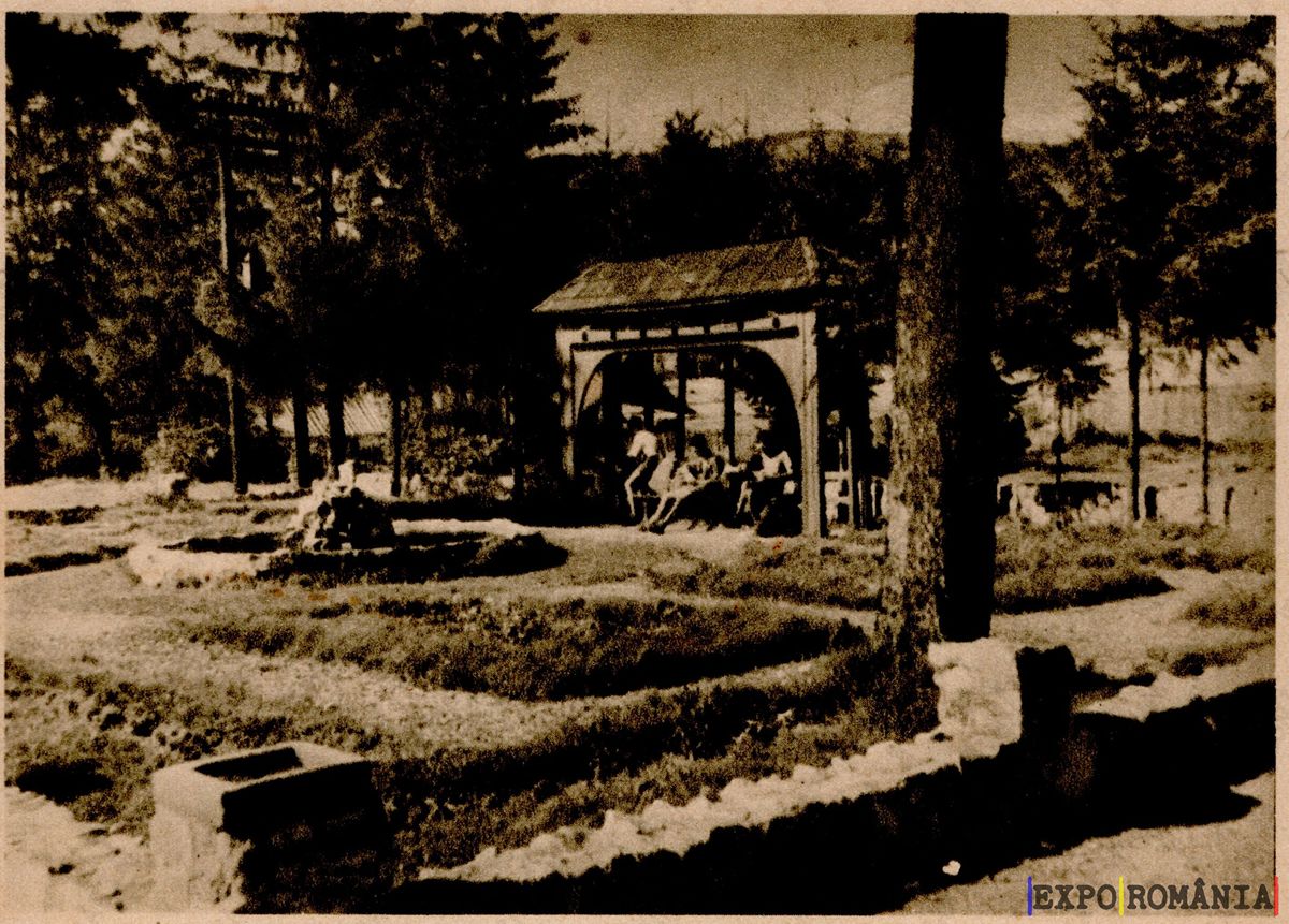 Imaginea reprezintă o carte poștală vintage din București, surprinzând o scenă liniștită dintr-un parc. În centrul imaginii se află un pavilion cu acoperiș, unde câțiva oameni stau așezați, probabil bucurându-se de o conversație sau de peisaj. În jurul pavilionului, se observă aranjamente de grădină cu iarbă verde și câteva plante, iar câțiva copaci înalți oferă umbră. Terenul este bine întreținut, iar atmosfera generală sugerează un loc de relaxare și recreere. Culoarea sepia a imaginii conferă un aer nostalgic, evocând o perioadă trecută.
