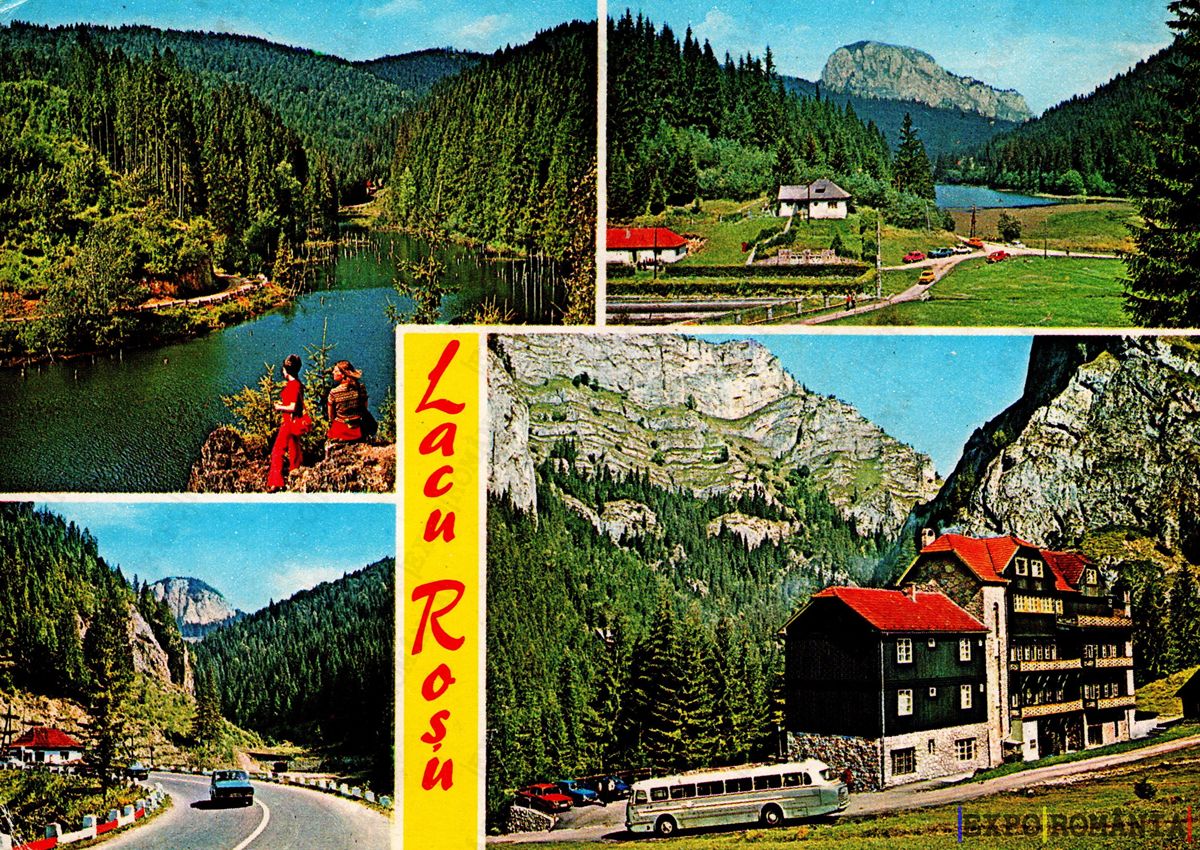 Imaginea reprezintă o carte poștală cu peisaje din zona Lacului Roșu, un loc pitorești din România. În colaje se pot observa: