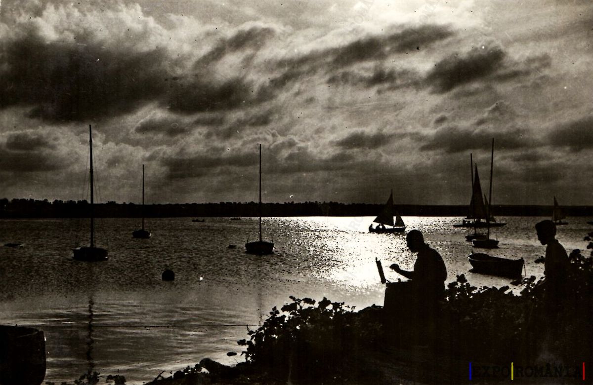 Imaginea prezintă un peisaj liniștit, cu un lac sau o apă liniștită, pe care se află mai multe bărci cu vele. Cerul este acoperit de nori, iar razele soarelui se reflectă pe suprafața apei, creând un efect strălucitor. În prim-plan, se observă siluetele a două persoane: una stând pe mal, concentrată asupra unei activități, iar cealaltă, mai departe, pare să se bucure de priveliște. Vegetația de pe mal adaugă o notă de naturalete imaginii, completând atmosfera de calm și relaxare.