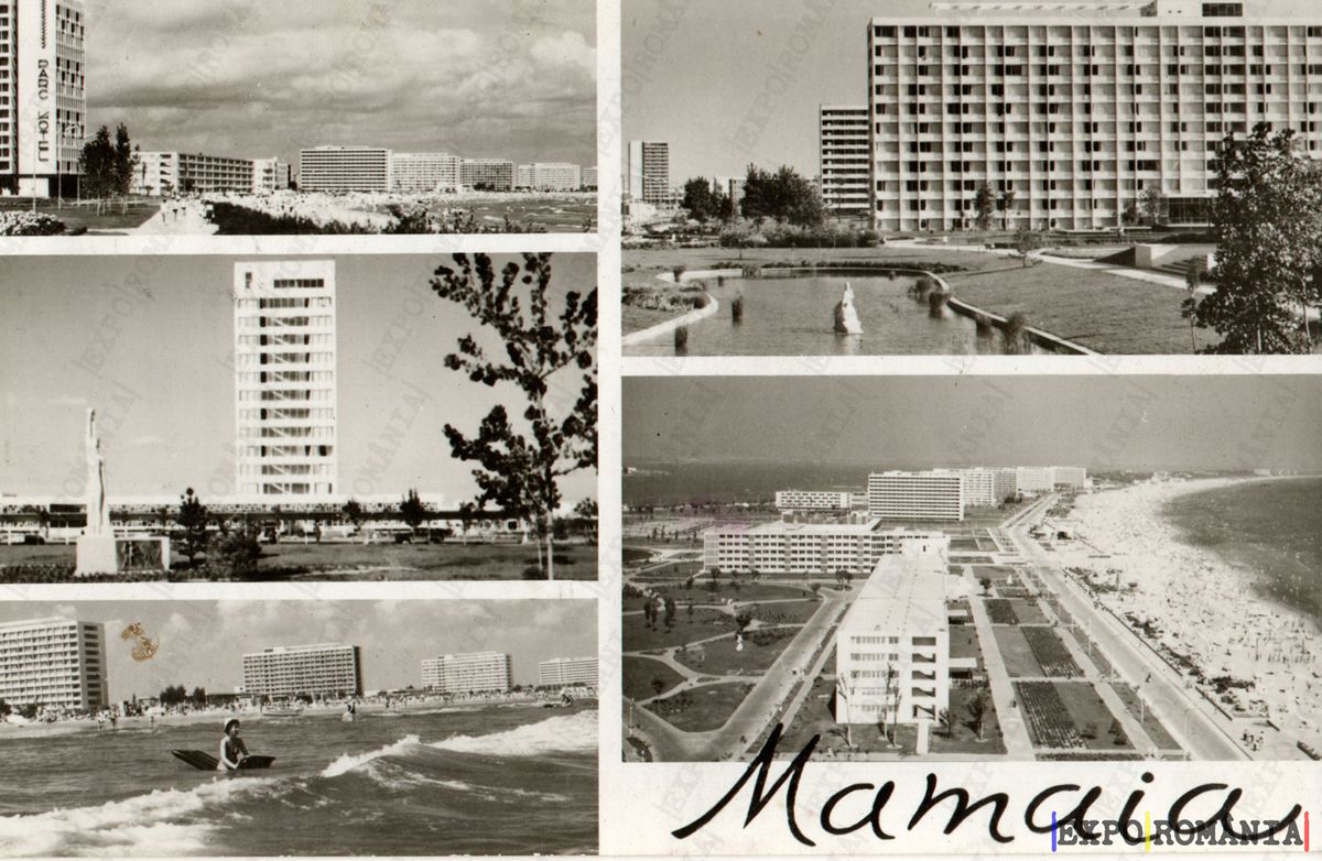 Imaginea reprezintă o carte poștală care ilustrează diverse scene din Mamaia, o stațiune de pe litoralul românesc. În colaje se pot observa clădiri moderne, plaje cu nisip și oameni care se bucură de activități acvatice. În partea de sus, se află o clădire înaltă, iar în colțul din stânga jos, un surfer navighează pe valuri. Alte imagini surprind peisaje cu vegetație și monumente, evidențiind atmosfera vibrantă a stațiunii. Textul „Mamaia” este scris cu un font elegant, adăugând un element artistic întregii compoziții.