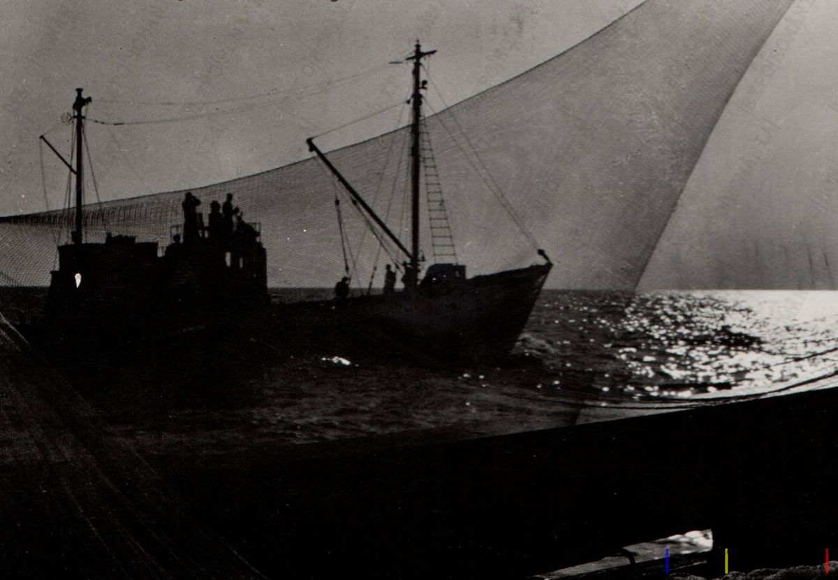 Imaginea prezintă o scenă maritimă, cu un peisaj în nuanțe de alb și negru. În prim-plan, se află o barcă de pescuit, cu un design clasic, ancorată lângă un ponton. Siluetele unor oameni sunt vizibile pe punte, sugerând activitate și viață pe apă. În fundal, se poate observa o altă ambarcațiune, iar marea reflectă lumina soarelui, creând un efect strălucitor pe suprafața apei. Cerul este parțial acoperit, adăugând o atmosferă dramatică imaginii. Această compoziție evocă o senzație de nostalgie și liniște, tipică pentru scenele maritime.