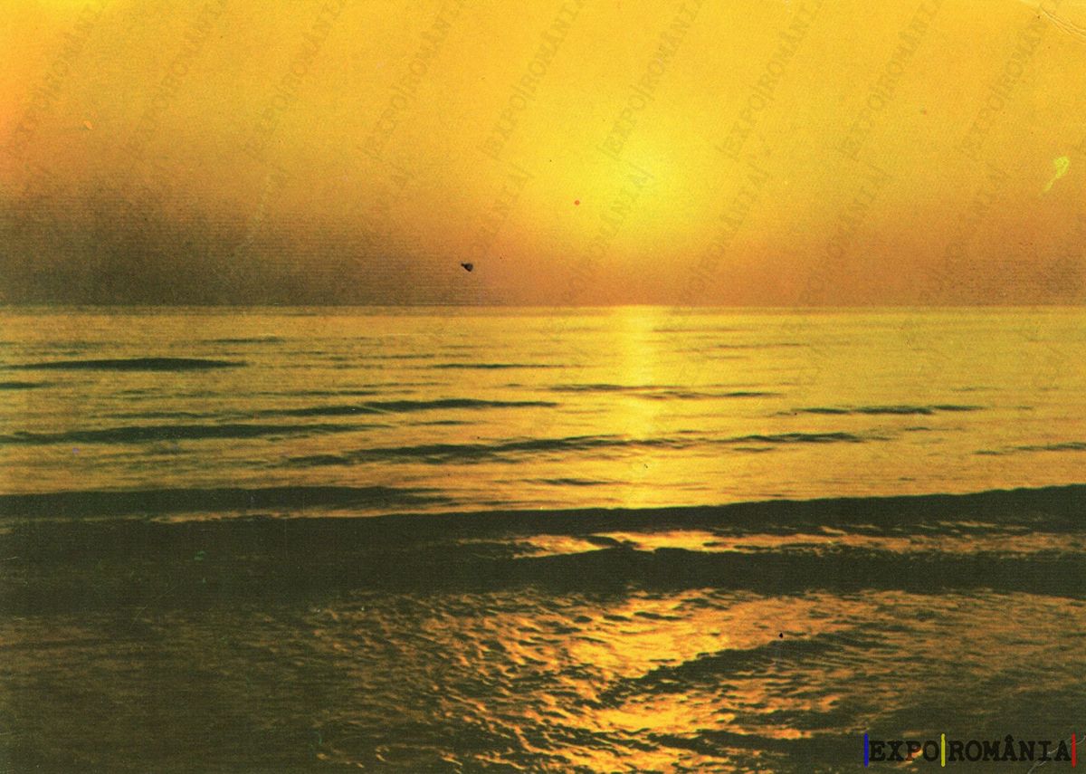 Imaginea prezintă un peisaj marin la apus, cu un cer de nuanțe calde de galben și portocaliu. Soarele se află aproape de orizont, reflectându-se pe suprafața apei, care are un aspect liniștit și unduitor. Valurile se sparg ușor la țărm, creând o atmosferă de calm și serenitate. În fundal, se pot observa câteva siluete neclare, iar întregul peisaj emană o senzație de liniște și frumusețe naturală.