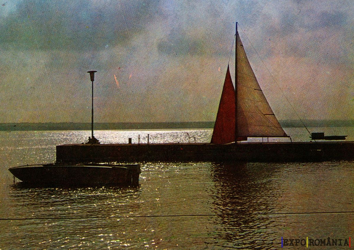 Imaginea surprinde un peisaj liniștit de apă, cu un iaht cu pânze colorate, ancorat lângă un ponton. Cerul este acoperit de nori, iar razele soarelui se reflectă pe suprafața apei, creând un efect strălucitor. În fundal, se poate observa o siluetă de alte bărci și un stâlp de iluminat pe ponton. Atmosfera este calmă și relaxantă, evocând o zi plăcută pe apă.