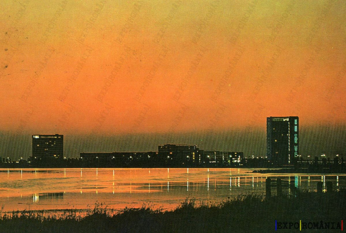 Imaginea prezintă un peisaj urban din București, surprins la apus. Cerul este colorat în nuanțe calde de portocaliu și galben, creând o atmosferă relaxantă. În prim-plan se află un lac sau o apă liniștită, care reflectă culorile cerului. Pe fundal, se pot observa clădiri moderne, cu feronerie iluminată, ce adaugă un contrast interesant cu natura din jur. Siluetele clădirilor sunt bine definite, iar lumina se răsfrânge pe suprafața apei, oferind un efect vizual plăcut. Peisajul evocă o combinație între urban și natural, sugerând o seară liniștită în capitala României.