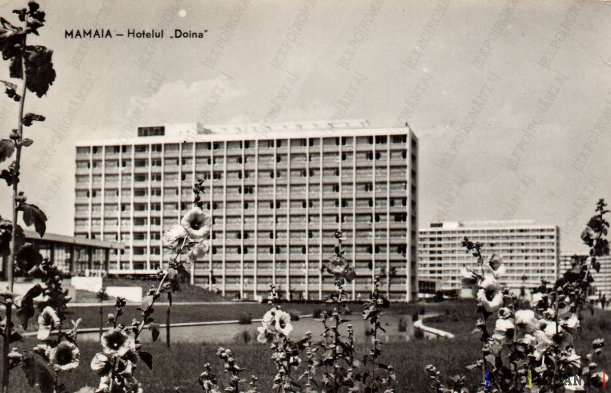 Imaginea reprezintă o carte poștală din Mamaia, România, evidențiind Hotelul „Doina”. Clădirea hotelului are un design modern, cu un aspect rectangular și feronerie de sticlă. În prim-plan, se află flori albe, care adaugă un contrast plăcut peisajului. Cerul este senin, iar atmosfera generală sugerează o zi însorită. Pe partea superioară a imaginii, textul indică locația și numele hotelului. Pe fundal, se observă o altă clădire similară, completând peisajul urban al zonei.