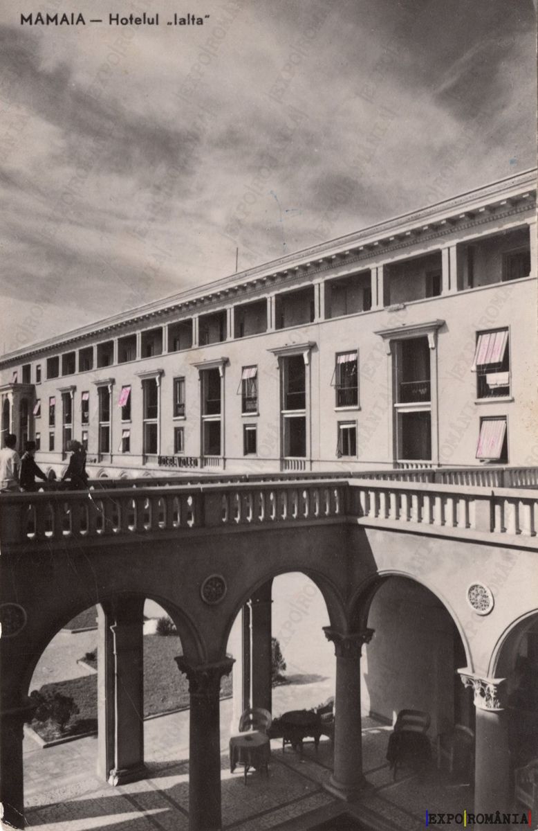 Imaginea prezintă o carte poștală veche din Mamaia, evidențiind Hotelul „Ialta”. Clădirea are un design arhitectural clasic, cu un etaj superior ce dispune de feronerie la feronerie, iar feroneriile sunt decorate cu draperii. La parter, se observă un arcade elegant, care oferă acces la o zonă interioară. În fundal, cerul este parțial noros, creând o atmosferă nostalgică. Detaliile arhitecturale și atmosfera generală sugerează o perioadă de glorie turistică.