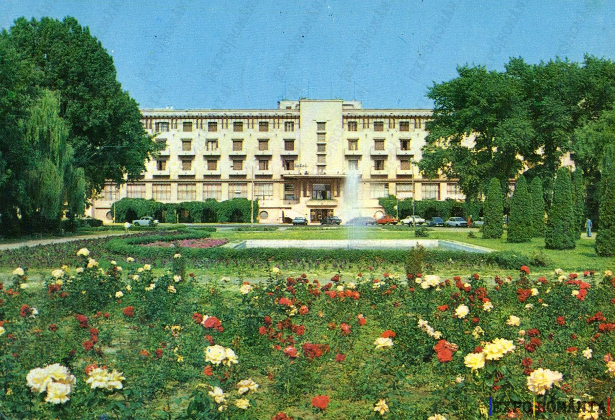 Imaginea prezintă o clădire impunătoare, situată în București, înconjurată de un peisaj verde. Fațada clădirii este decorată cu elemente arhitecturale distincte, iar la baza acesteia se află o fântână care adaugă un element de eleganță. În prim-plan, un parc bine întreținut este plin de flori, în special trandafiri de diverse culori, care oferă un contrast vibrant cu vegetația verde din jur. Copacii mari și umbroși completează atmosfera plăcută a locului, creând un cadru idilic pentru vizitatori. Cerul este senin, sugerând o zi frumoasă.
