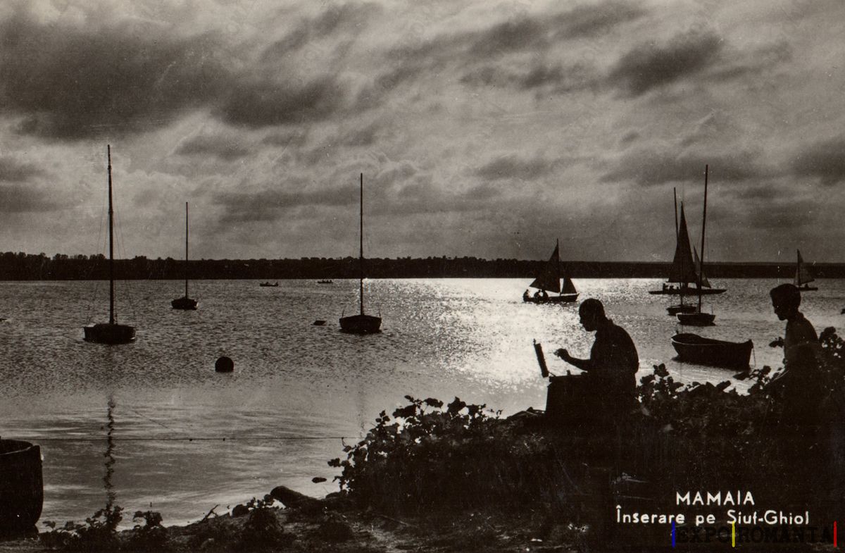 Imaginea reprezintă o carte poștală din Mamaia, surprinzând un peisaj de seară pe lacul Siut-Ghiol. În prim-plan, se observă o siluetă umană așezată pe mal, concentrată asupra unei activități, poate scriind sau citind. Lacul este calm, reflectând lumina blândă a apusului, iar în fundal se văd mai multe bărci cu vele ancorate, adăugând un sentiment de serenitate. Cerul este acoperit de nori, iar atmosfera generală evocă o stare de liniște și contemplare. Textul de pe cartea poștală indică locația și momentul zilei, subliniind frumusețea naturală a zonei.
