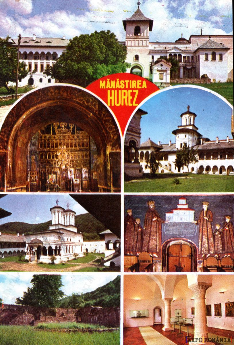 În colțurile inferioare sunt prezentate detalii ale interiorului mănăstirii, inclusiv fresce elaborate și coloane sculptate, care reflectă stilul artistic specific. De asemenea, sunt incluse imagini ale curții interioare și ale peisajului din jur, sugerând un loc de liniște și spiritualitate. Textul „Mănăstirea Hurezi” este plasat central, subliniind importanța acestui monument istoric.