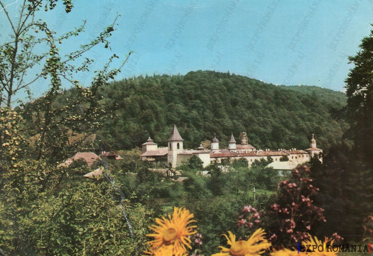 Imaginea prezintă un peisaj idilic, cu un complex monastic situat pe o panta de deal, înconjurat de vegetație abundentă. Clădirile au arhitectură tradițională, cu turnuri și acoperișuri înclinate, evidențiind detalii istorice. În prim-plan, se află flori galbene și roz, care adaugă o notă de culoare și vitalitate. Fundalul este dominat de păduri verzi, sugerând o atmosferă de liniște și serenitate. Cerul este senin, cu nuanțe de albastru care completează peisajul natural.