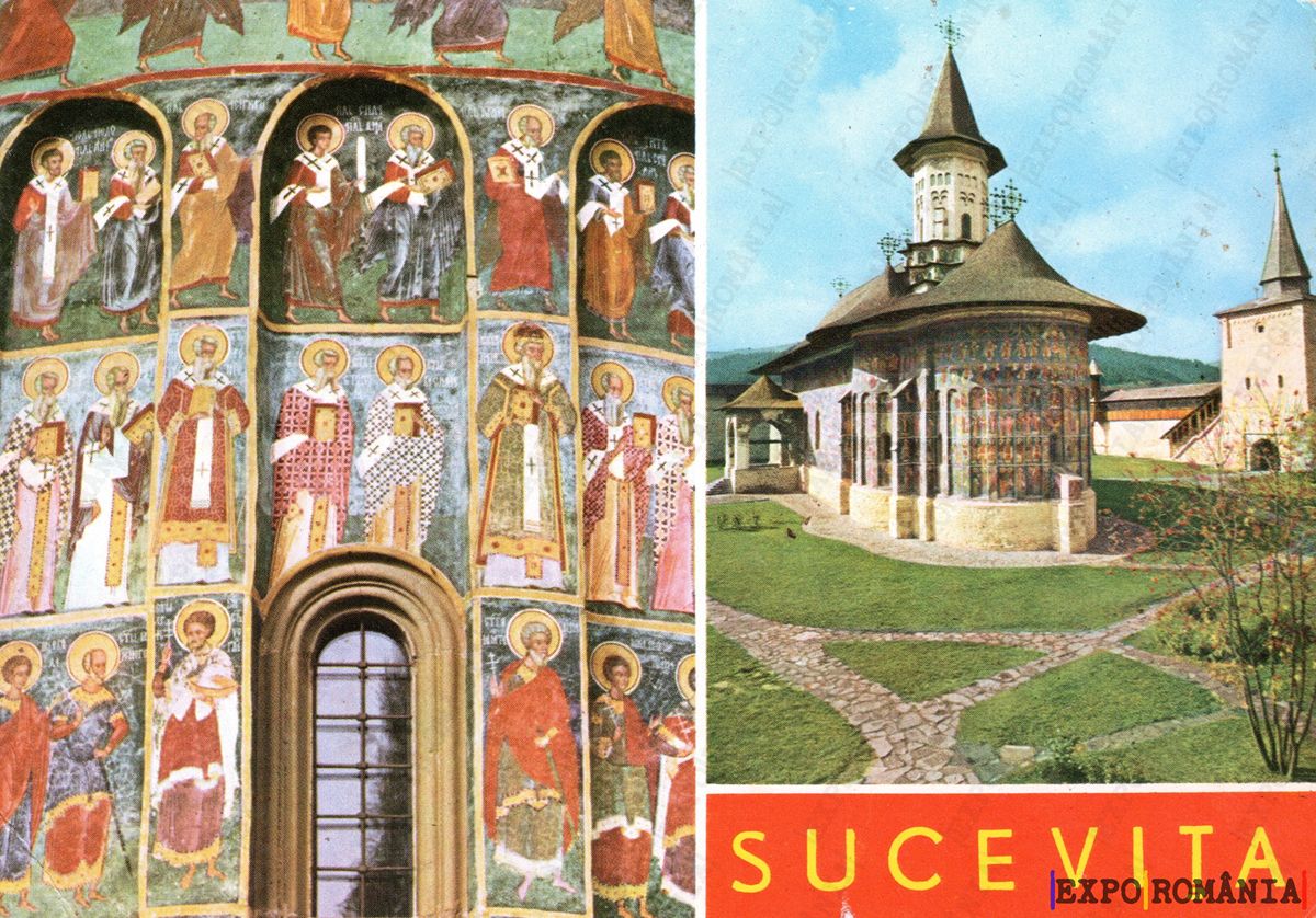 Imaginea reprezintă o carte poștală care ilustrează mănăstirea Sucevița, un monument emblematic din România. Pe partea stângă, se observă detalii ale fațadei decorate cu fresce colorate, ce înfățișează sfinți și scene biblice, evidențiind arta medievală bizantină. Pe partea dreaptă, se află o vedere generală a mănăstirii, cu turla sa distinctivă și clădirile adiacente, înconjurate de un peisaj verde. Fundalul este senin, iar cărările din piatră sugerează un loc de liniște și reflecție. Textul „SUCEVIȚA” este scris într-un font proeminent, aducând un omagiu acestui important sit cultural.