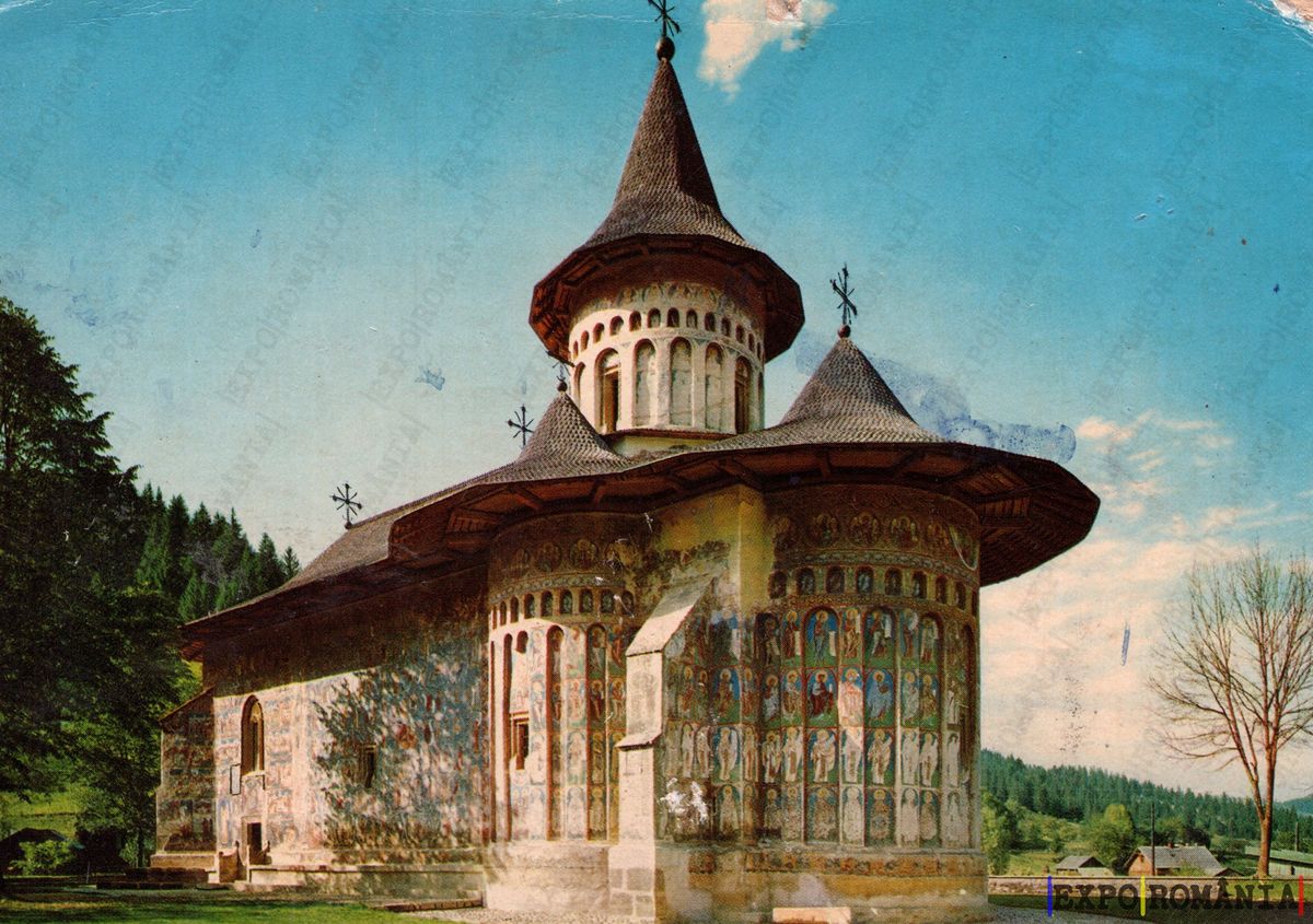 Imaginea prezintă o biserică cu un design arhitectural distinctiv, caracterizată printr-un acoperiș înalt, conic, și turnuri decorative. Fațada este împodobită cu fresce colorate, reprezentând scene religioase, care adaugă un element vibrant și artistic. Biserica este înconjurată de un peisaj natural, cu copaci verzi și un cer senin, sugerând o atmosferă liniștită și pitorească. Detaliile arhitecturale și culorile vii ale frescelor evidențiază tradiția culturală și spirituală a zonei.