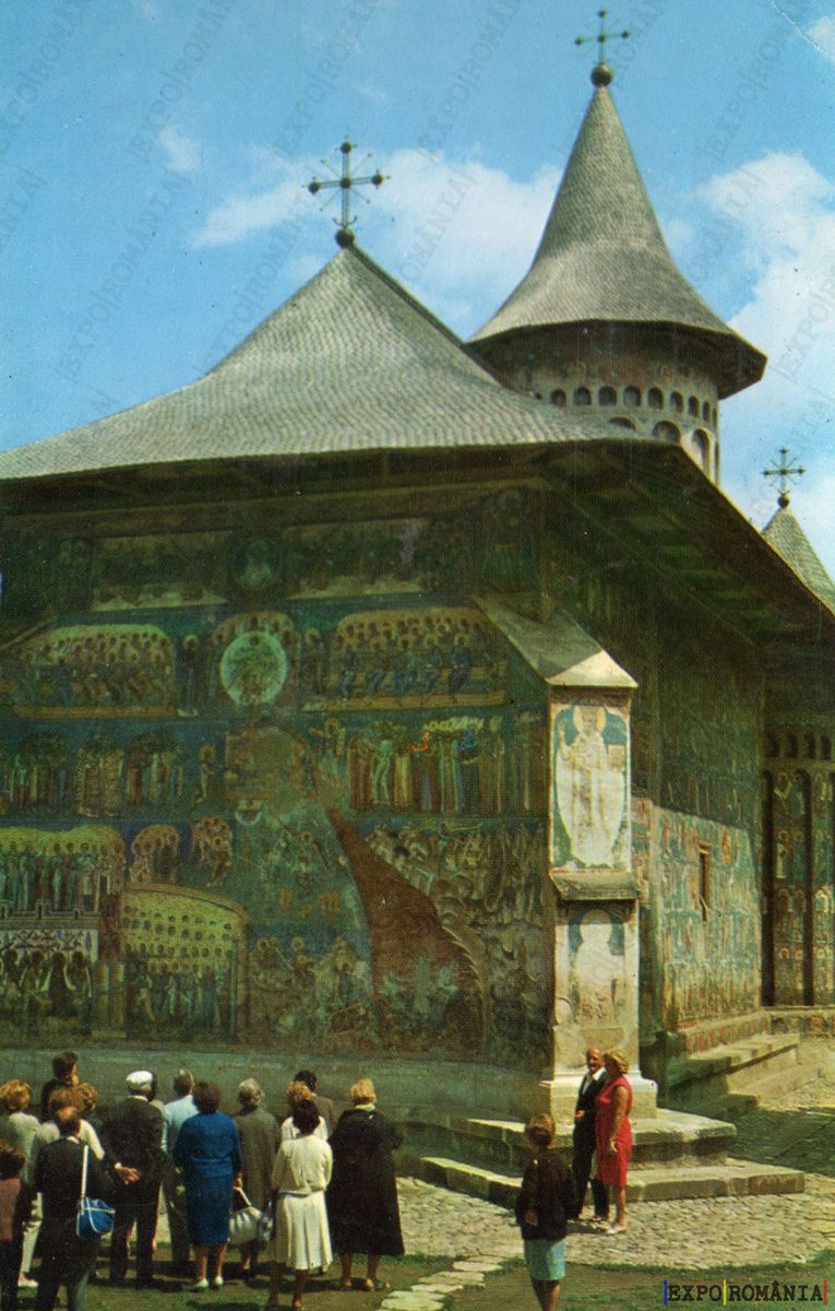 Imaginea prezintă o biserică cu o arhitectură distinctivă, caracterizată printr-un acoperiș înclinat și turnuri cu cruce. Fațada este decorată cu fresce colorate, reprezentând scene biblice și motive religioase, care atrag atenția vizitatorilor. În fața bisericii, un grup de oameni admiră detaliile artistice ale clădirii. Cerul este senin, iar atmosfera este una de liniște și contemplare, evidențiind frumusețea culturală și spirituală a locului. Pavajul din piatră adaugă un element rustic peisajului.