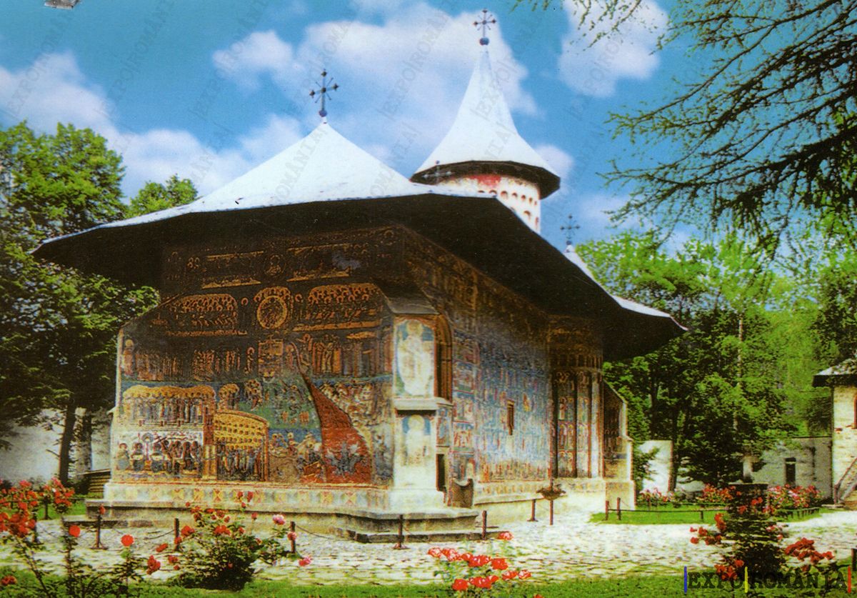 Imaginea prezintă o biserică cu o arhitectură distinctivă, acoperită cu fresce colorate care ilustrează scene biblice și motive religioase. Clădirea are un acoperiș înalt, în formă de con, și este înconjurată de un peisaj verde, cu copaci și flori. Grădina din jur este bine întreținută, iar florile adaugă o notă de culoare vibrantă. Cerul este senin, iar lumina naturală evidențiază detaliile artistice ale frescelor. Această imagine evocă un sentiment de liniște și spiritualitate, reflectând tradiția culturală și religioasă a zonei.