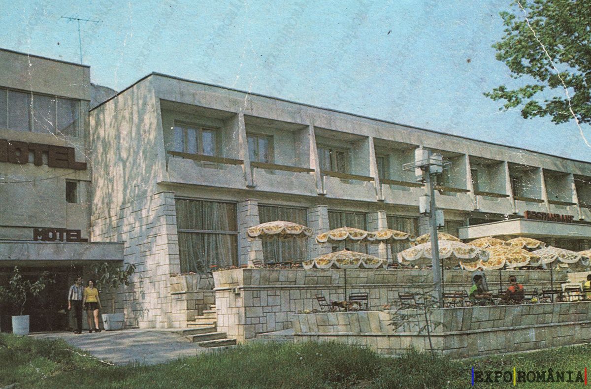 Imaginile prezintă o clădire de hotel din București, cu un design arhitectural simplu și modern. Fațada este realizată din piatră, având feronerie metalică și feronerie din lemn. La parter, se află intrarea principală, marcată de un semn cu inscripția „HOTEL”. În fața clădirii, există o terasă cu mese și umbrele, unde se pot observa câțiva oameni relaxându-se. În jurul clădirii, se află o zonă verde, cu iarbă și câțiva copaci, care adaugă un aspect plăcut și natural peisajului. Cerul este senin, sugerând o zi frumoasă.