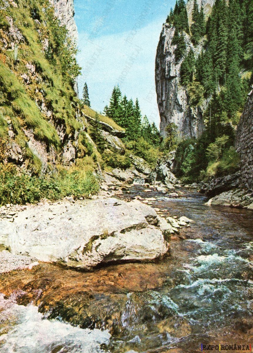 Imaginea prezintă un peisaj montan, cu un râu care curge printr-o vale strânsă, înconjurată de stânci abrupte și vegetație abundentă. Malurile râului sunt acoperite cu iarbă verde și arbuști, iar în fundal se observă copaci înalți, care adaugă un contrast de culoare. Cerul este senin, cu câteva nori pufoși, iar lumina soarelui iluminează scena, evidențiind strălucirea apei. Stâncile din jur sunt impozante, creând un cadru natural spectaculos. Această imagine evocă o atmosferă de liniște și frumusețe sălbatică.