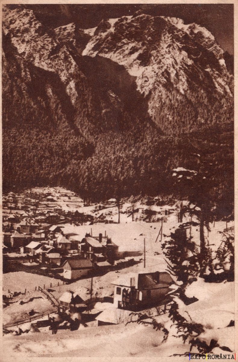 Imaginea reprezintă o carte poștală în tonuri de sepia, care surprinde un peisaj montan. În prim-plan, se observă un sat mic, cu case tradiționale, așezate pe un teren acoperit de zăpadă. Casele sunt înghesuite și au acoperișuri înclinate, specific arhitecturii montane. În fundal, se ridică munți impunători, cu vârfuri stâncoase și acoperite de zăpadă, care contrastează cu pădurea de conifere ce se întinde la baza lor. Atmosfera este una de liniște și frumusețe naturală, evocând un peisaj de iarnă idilic.