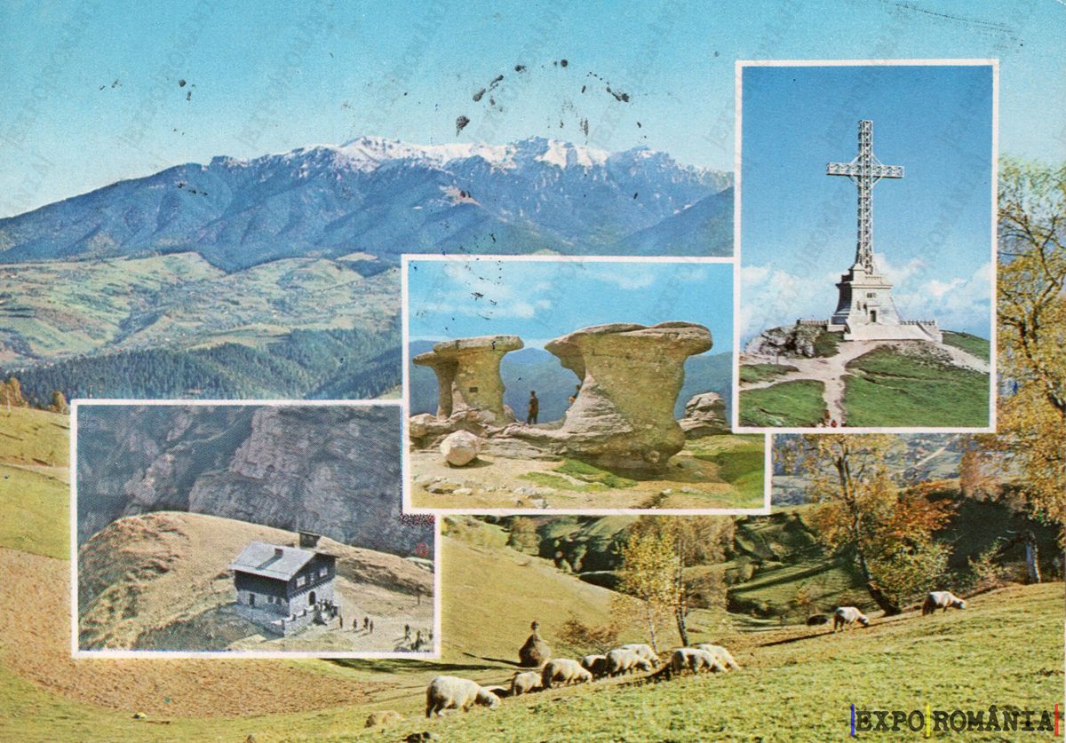 Imaginea reprezintă o carte poștală care ilustrează peisaje montane din România. În partea superioară, se află un masiv montan acoperit cu zăpadă, cu vârfuri înalte și un cer senin. În centrul imaginii, se observă formațiuni stâncoase neobișnuite, iar în apropiere, o cabană rustică este așezată pe o pajiște verde. În colțul din dreapta, se află un monument cu o cruce mare, amplasat pe un deal, înconjurat de copaci și vegetație. Pe fundal, se pot vedea oi păscând pe câmpia verde, completând astfel atmosfera pastorală a zonei.
