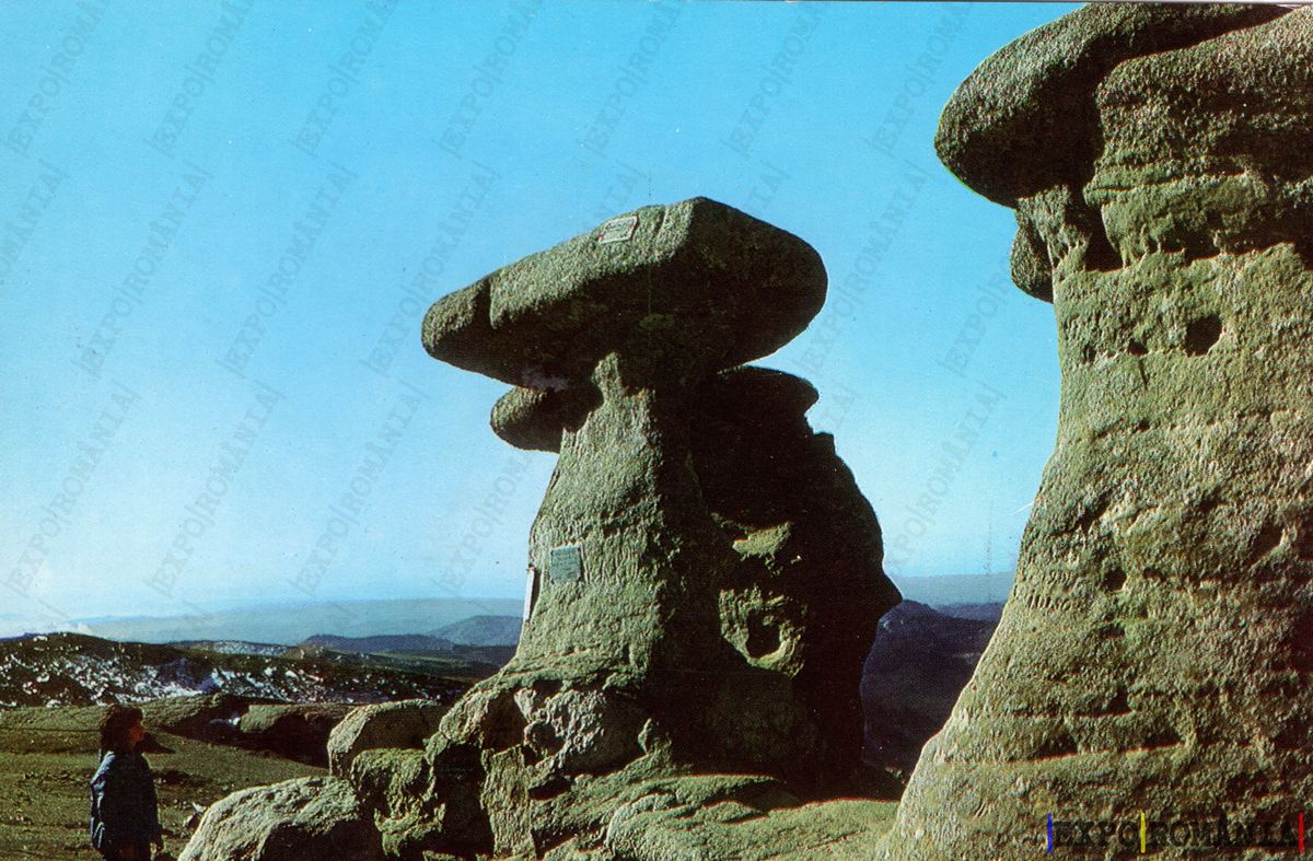 Imaginea prezintă un peisaj montan cu formațiuni stâncoase impresionante, cunoscute sub numele de „Babele” și „Sfinxul”, situate în zona Bucegi din România. Stâncile au forme neobișnuite, cu vârfuri plate și contururi erodate, care le conferă un aspect distinctiv. Cerul este senin, cu nuanțe de albastru, iar în fundal se pot observa coline și văi, sugerând o vastitate naturală. O persoană mică, aflată în prim-plan, pare să admire aceste formațiuni, evidențiind dimensiunile impresionante ale stâncilor. Peisajul transmite o senzație de mister și frumusețe naturală.