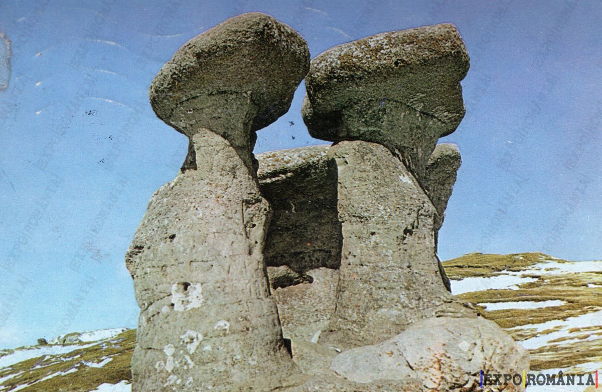 Imaginea reprezintă o formațiune stâncoasă impresionantă, cu două mari blocuri de piatră, fiecare având un capăt rotunjit, care par să se sprijine unul pe altul. Stâncile sunt de culoare deschisă, iar textura lor este aspră, evidențiind eroziunea provocată de vreme. În fundal, se observă un cer senin, de un albastru intens, iar la baza formațiunii se află o zonă cu iarbă verde, ce sugerează un peisaj montan. Această imagine evocă un sentiment de mister și frumusețe naturală.