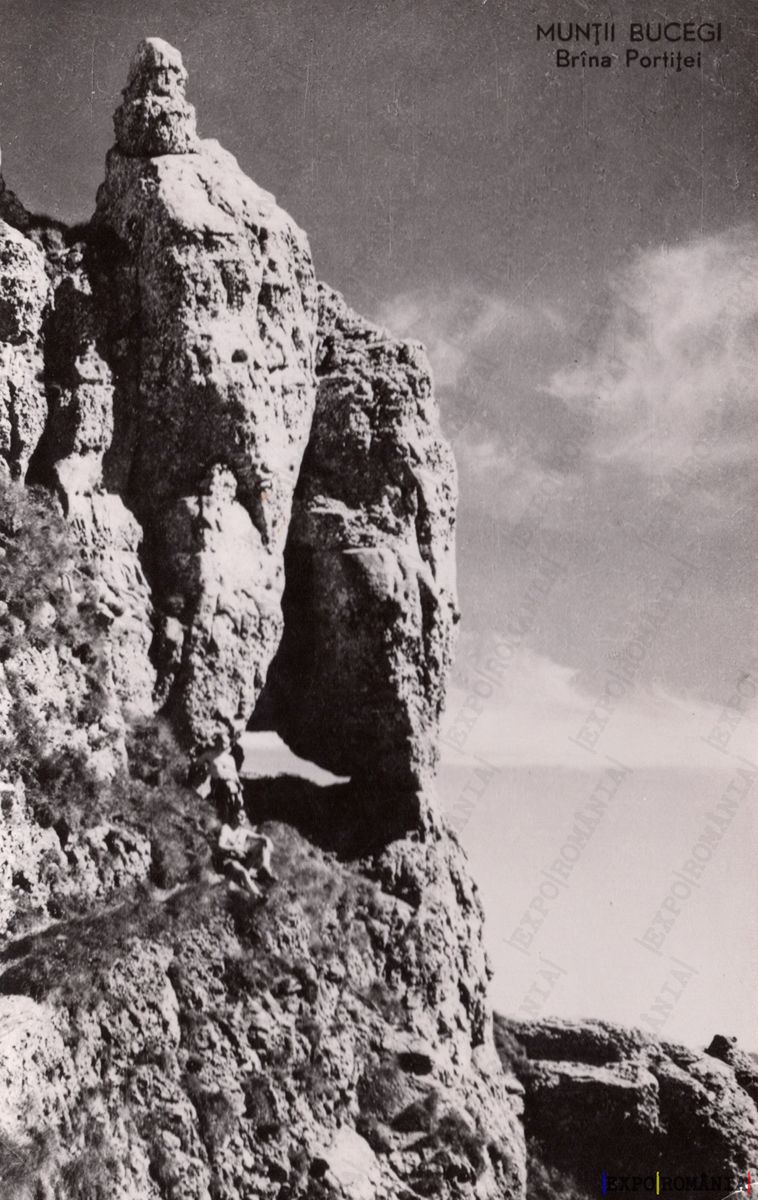 Imaginea reprezintă un peisaj montan din Munții Bucegi, evidențiind o formațiune stâncoasă distinctivă, cunoscută sub numele de Brâna Portiței. Stânca are o formă unică, cu un arc natural care creează o deschidere vizibilă. Fundalul este dominat de un cer senin, cu câteva nori pufoși, iar detaliile texturii stâncii sugerează o erodare naturală de-a lungul timpului. Imaginea transmite o atmosferă de liniște și măreție a naturii. Textul din colțul superior al imaginii indică locația, specificând „MUNTII BUCEGI” și „Brâna Portiței”.