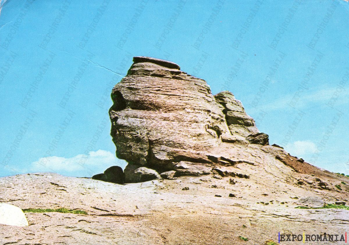 Imaginea prezintă o formațiune stâncoasă, cunoscută sub numele de Sfinxul din Bucegi. Aceasta are o formă distinctivă, asemănătoare cu un chip uman, fiind sculptată de eroziune în timp. Fundalul este de un albastru deschis, sugerând o zi senină, iar peisajul din jur este arid, cu sol expus și câteva iarbă verde. Formațiunea stâncoasă se ridică impunător, evidențiind detalii texturate ale rocii. Această imagine evocă un sentiment de mister și naturalețe, fiind un simbol al frumuseții naturale a regiunii.