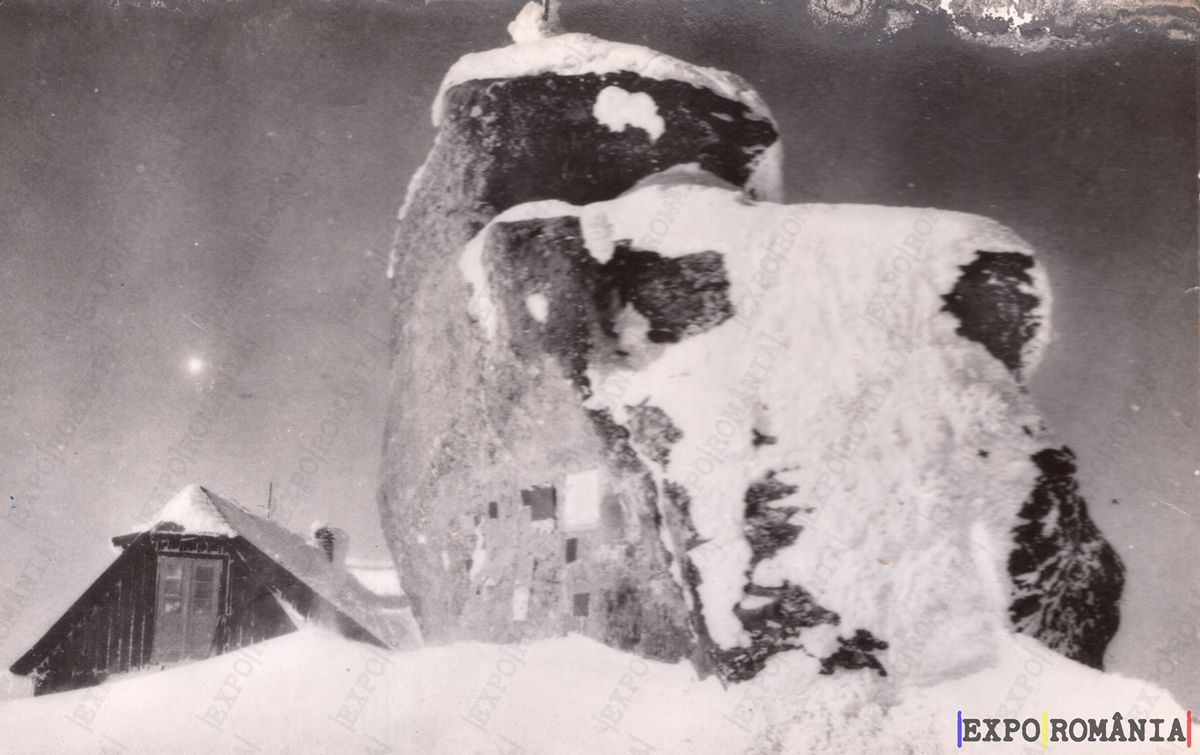 Imaginea prezintă un peisaj montan acoperit de zăpadă, cu un stâncă impunătoare în prim-plan. Stânca, masivă și acoperită parțial de zăpadă, se ridică deasupra unui adăpost rustic, construit din lemn. Acoperișul adăpostului este, de asemenea, acoperit cu zăpadă, sugerând o atmosferă de iarnă. Fundalul este dominat de un cer întunecat, iar lumina lunii poate fi observată în colțul imaginii, adăugând un aer misterios scenei. Detaliile sunt blânde și contrastante, evocând o senzație de liniște și izolare în mijlocul naturii.