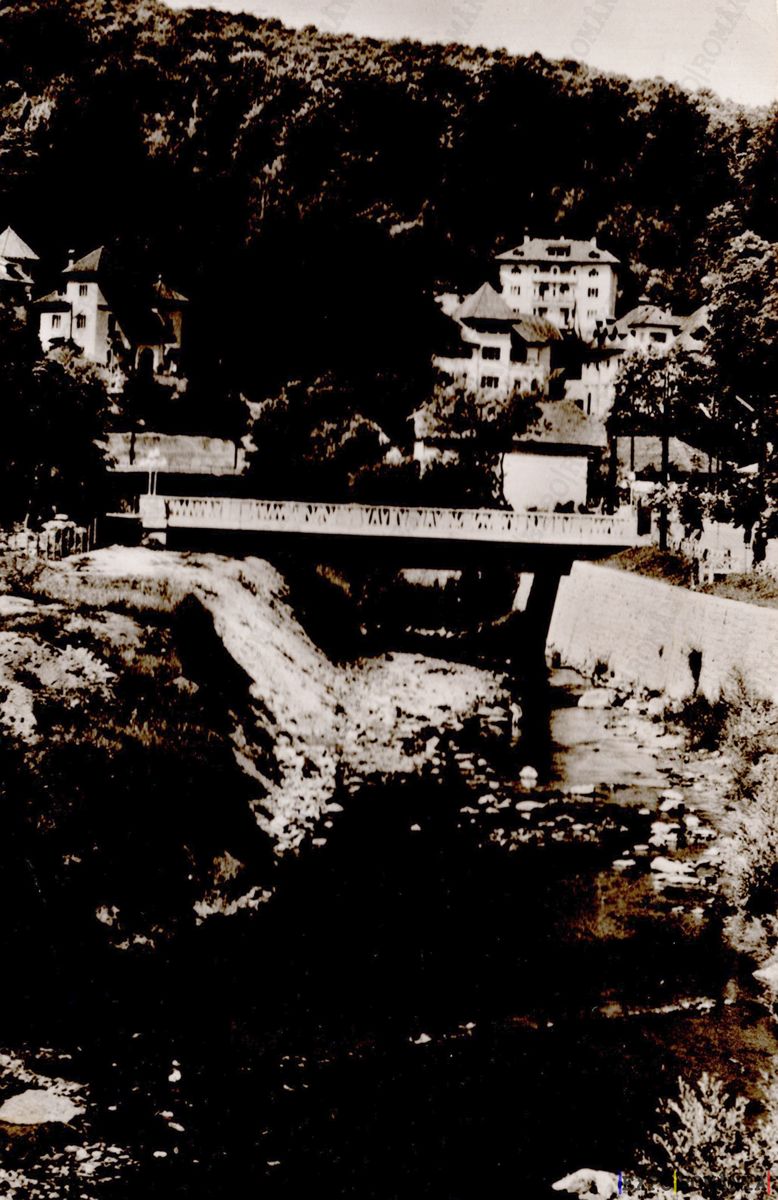 Imaginea reprezintă o carte poștală în alb-negru, care surprinde un peisaj urban din București. În prim-plan se află un pod ce traversează un curs de apă, cu o structură simplă, dar elegantă. Pe malurile râului se pot observa pietre și vegetație, iar în fundal se ridică clădiri de diferite dimensiuni, ce par a fi locuințe. Pădurea sau dealurile acoperite cu copaci se află în spatele clădirilor, adăugând un contrast natural peisajului urban. Atmosfera generală este una liniștită, evocând o perioadă mai veche a orașului.