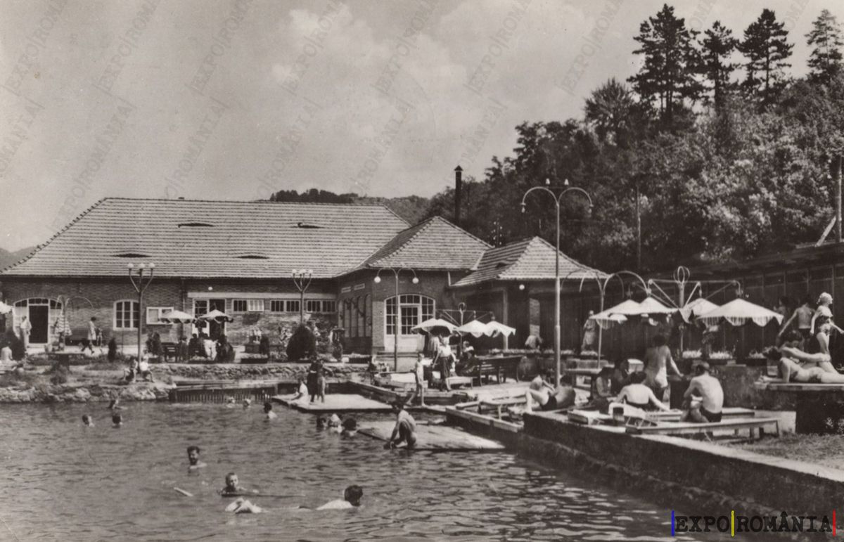 Imaginea reprezintă o scenă dintr-o stațiune de băi din București, probabil din perioada interbelică. În prim-plan, se află o piscină în aer liber, unde mai multe persoane se bucură de apă, unii înotând, iar alții relaxându-se pe margine. În fundal, se observă o clădire cu un acoperiș înclinat, construită din piatră sau cărămidă, care servește ca centru de servicii pentru vizitatori.