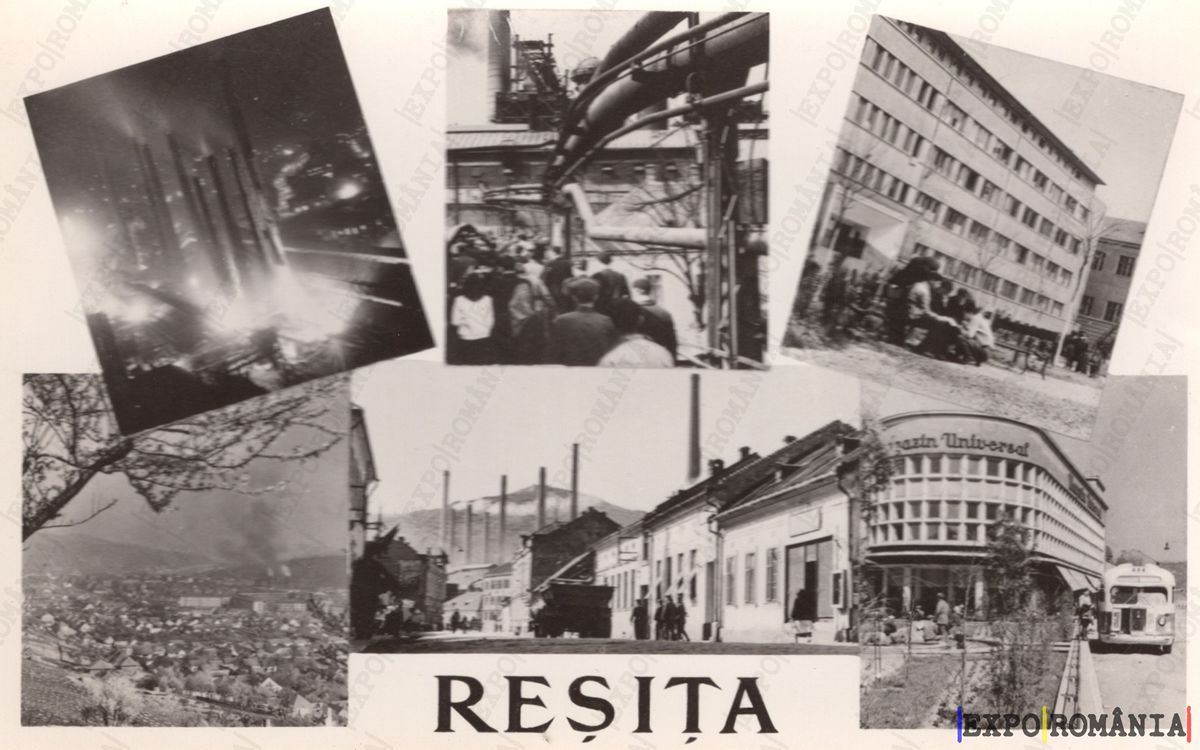Imaginea reprezintă o carte poștală dedicată orașului Reșița, România. Aceasta este compusă din mai multe fotografii, fiecare surprinzând aspecte diferite ale orașului.