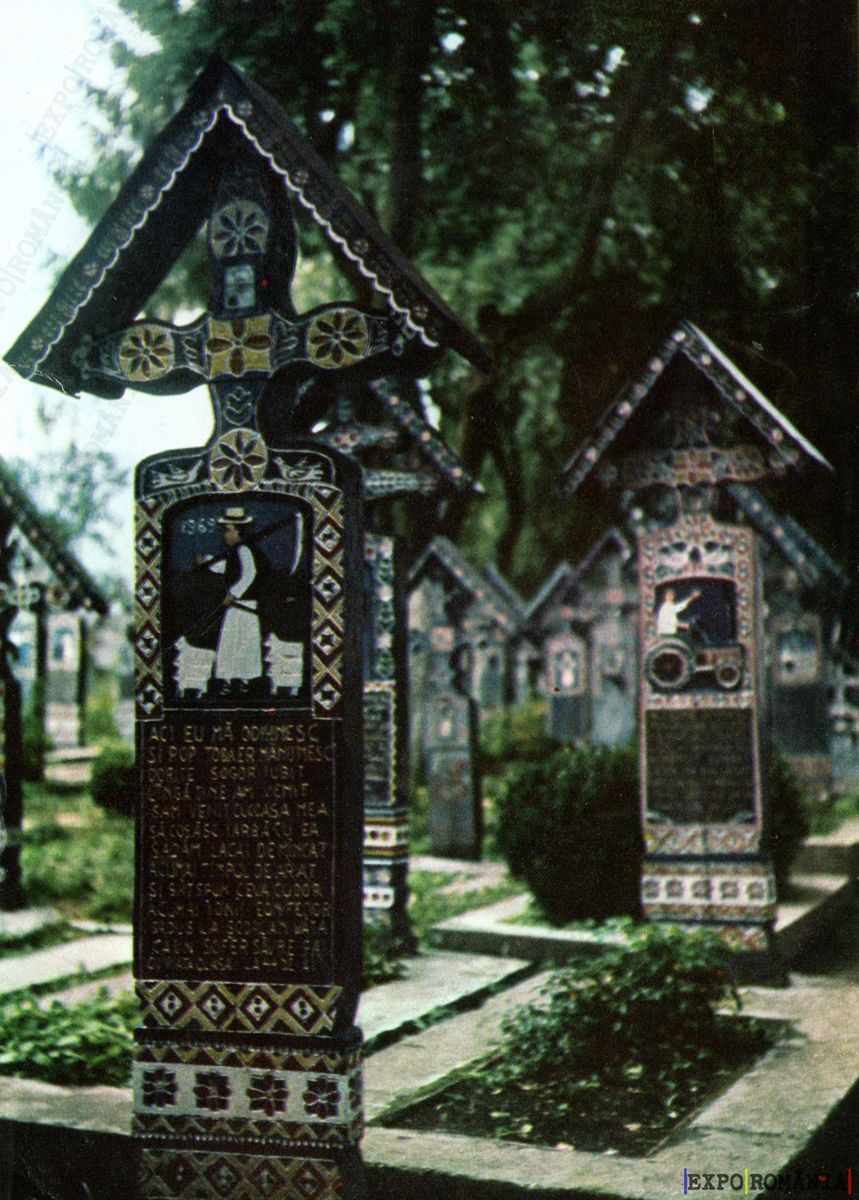 Imaginea prezintă un cimitir cu cruci colorate, fiecare având un design artistic distinct. Crucile sunt decorate cu motive florale și scene din viața cotidiană, iar unele au inscripții care povestesc despre persoanele înmormântate. Fundalul este verde, cu copaci care oferă umbră, iar atmosfera generală este una de liniște și reflecție. Această scenă evocă tradiția culturală și artistică a regiunii, fiind un exemplu de artă populară românească.