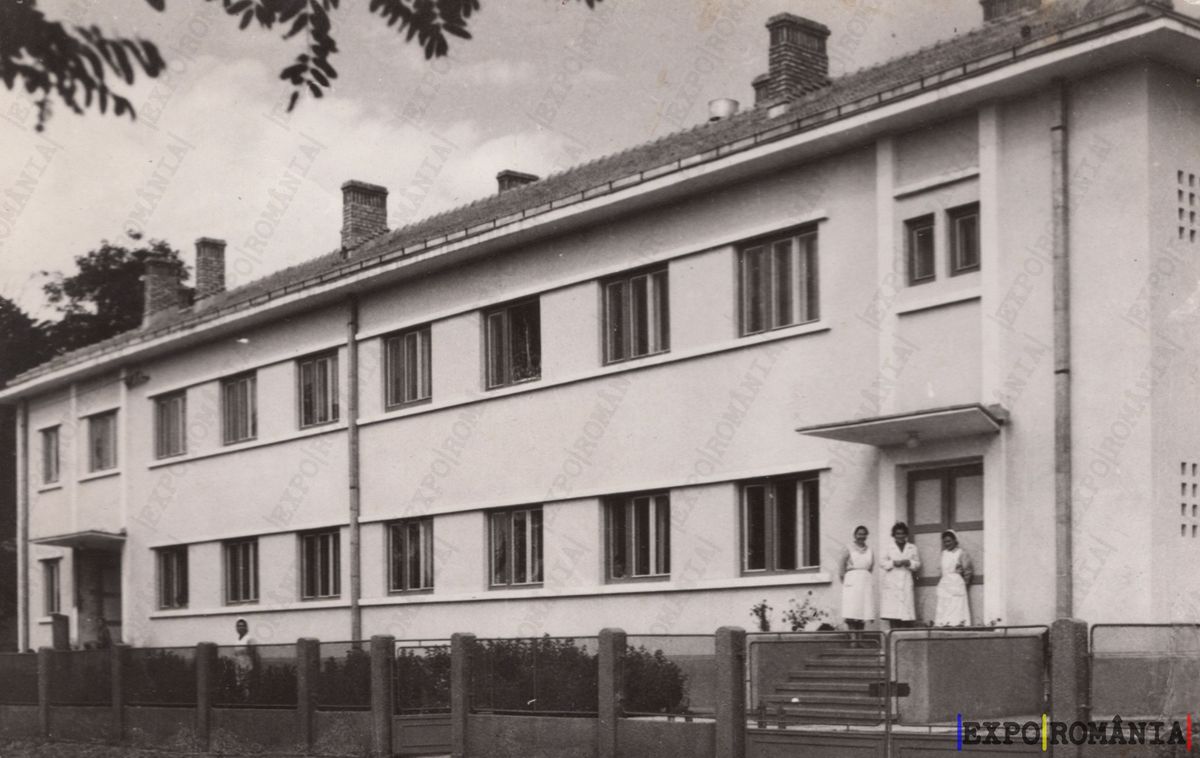Imaginea reprezintă o clădire de tip rezidențial din București, cu un design simplu și funcțional. Fațada este albă, cu feronerie din lemn la feronerie, iar feroneria este dispusă simetric. Clădirea are două etaje, iar la intrare se află o scară cu balustradă. În fața clădirii, se pot observa câțiva oameni îmbrăcați în uniforme albe, sugerând un context instituțional sau de îngrijire. În jurul clădirii, există un spațiu verde, cu plante și copaci care adaugă un aer de prospețime. Cerul este parțial noros, oferind o atmosferă calmă și nostalgic.