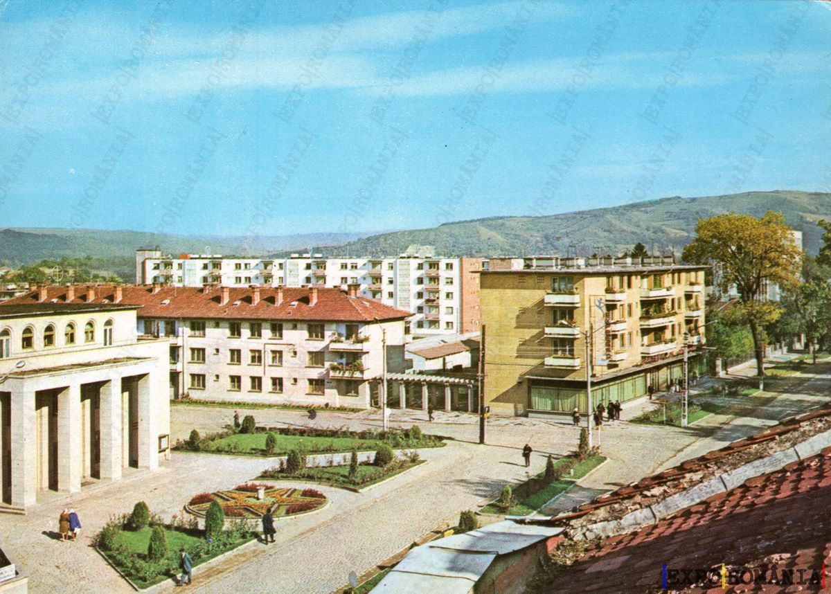 Imaginea prezintă o zonă urbană din București, cu clădiri de diferite stiluri arhitecturale. În prim-plan, se observă o piață sau un parc amenajat, cu flori colorate și alei pietonale. Clădirile din jur sunt de tip bloc, cu etaje multiple, unele având balcoane. În fundal, se zăresc dealuri sau coline, sugerând un peisaj natural care încadrează orașul. Cerul este senin, iar atmosfera generală transmite o senzație de liniște și ordine urbană. Oamenii se plimbă pe aleile din zonă, adăugând viață imaginii.