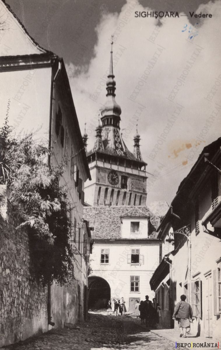 Imaginea reprezintă o carte poștală alb-negru din Sighișoara, România. În centrul compoziției se află o stradă îngustă, pavată cu piatră, care duce spre un turn impunător, cu un ceas la baza sa. Turnul este înconjurat de clădiri istorice cu arhitectură tradițională, având feronerie și detalii decorative. Cerul este parțial acoperit de nori, iar câțiva oameni se plimbă pe stradă, adăugând viață scenei. Vegetația apare în colțurile imaginii, sugerând un mediu natural în apropiere. Textul din colțul de sus indică locația: „SIGHIȘOARA – Vedere”.