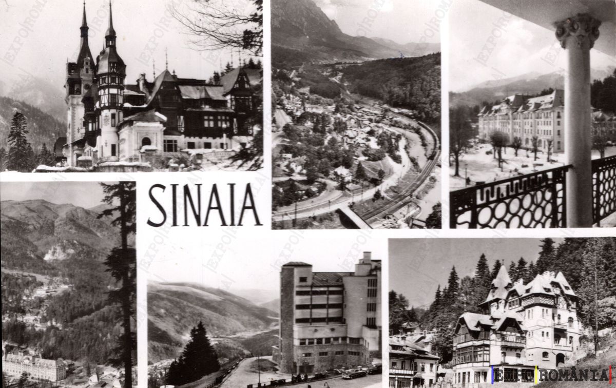 Imaginea reprezintă o carte poștală din Sinaia, România, cu un colaj de fotografii în alb și negru. În partea stângă sus, se află Castelul Peleș, un exemplu impresionant de arhitectură neo-renascentistă, cu turnuri și detalii ornamentale. Sub acesta, se poate observa o vale montană, cu un râu care curge printre casele din apropiere. În partea dreaptă sus, se vede un peisaj montan, cu vârfuri acoperite de pădure. În colțul din dreapta jos, sunt prezentate clădiri elegante, caracteristice zonei, iar în partea stângă jos apare o clădire modernă. Textul „SINAIA” este plasat central, evidențiind destinația turistică. Această imagine surprinde frumusețea naturală și arhitecturală a regiunii.